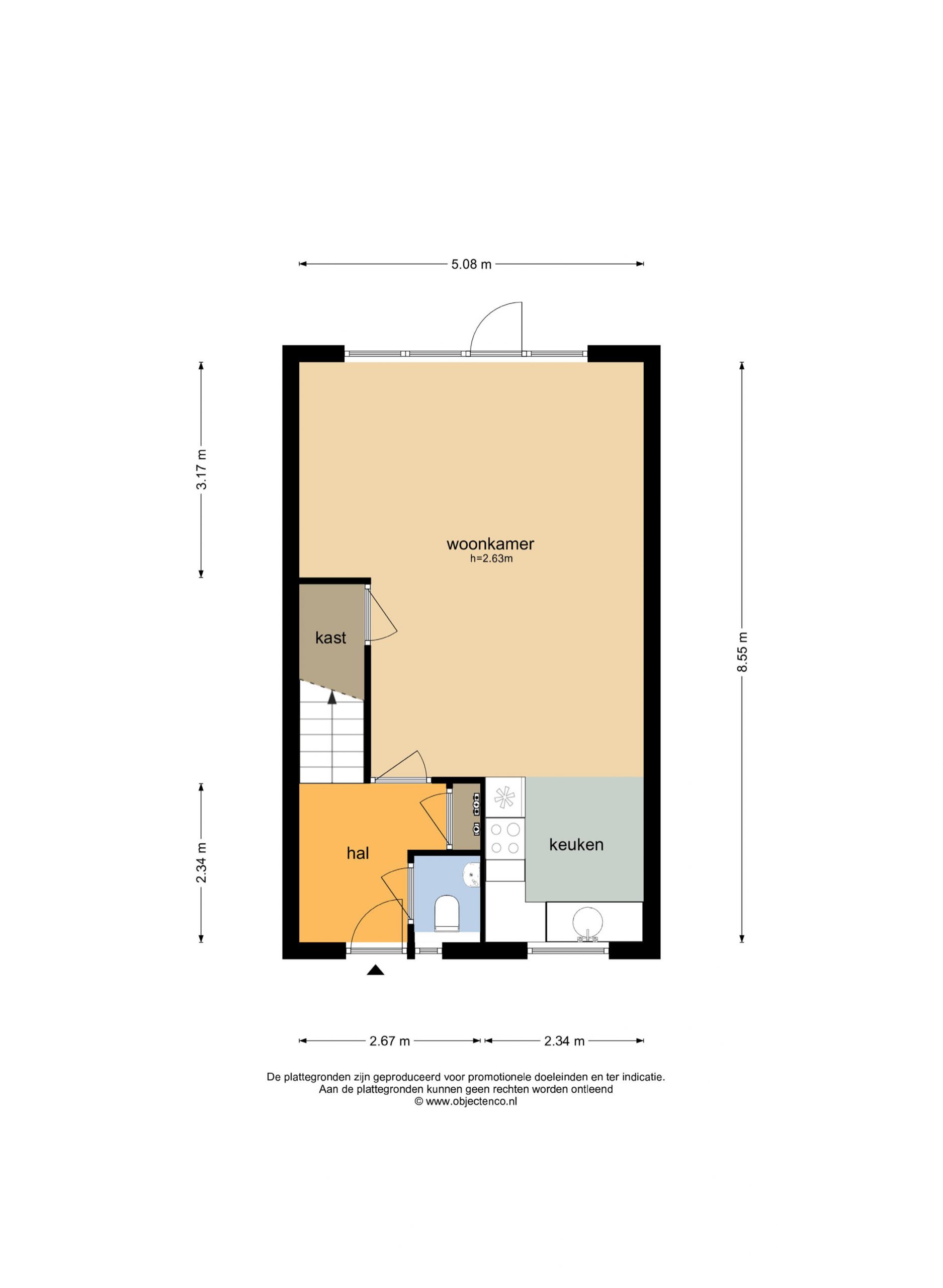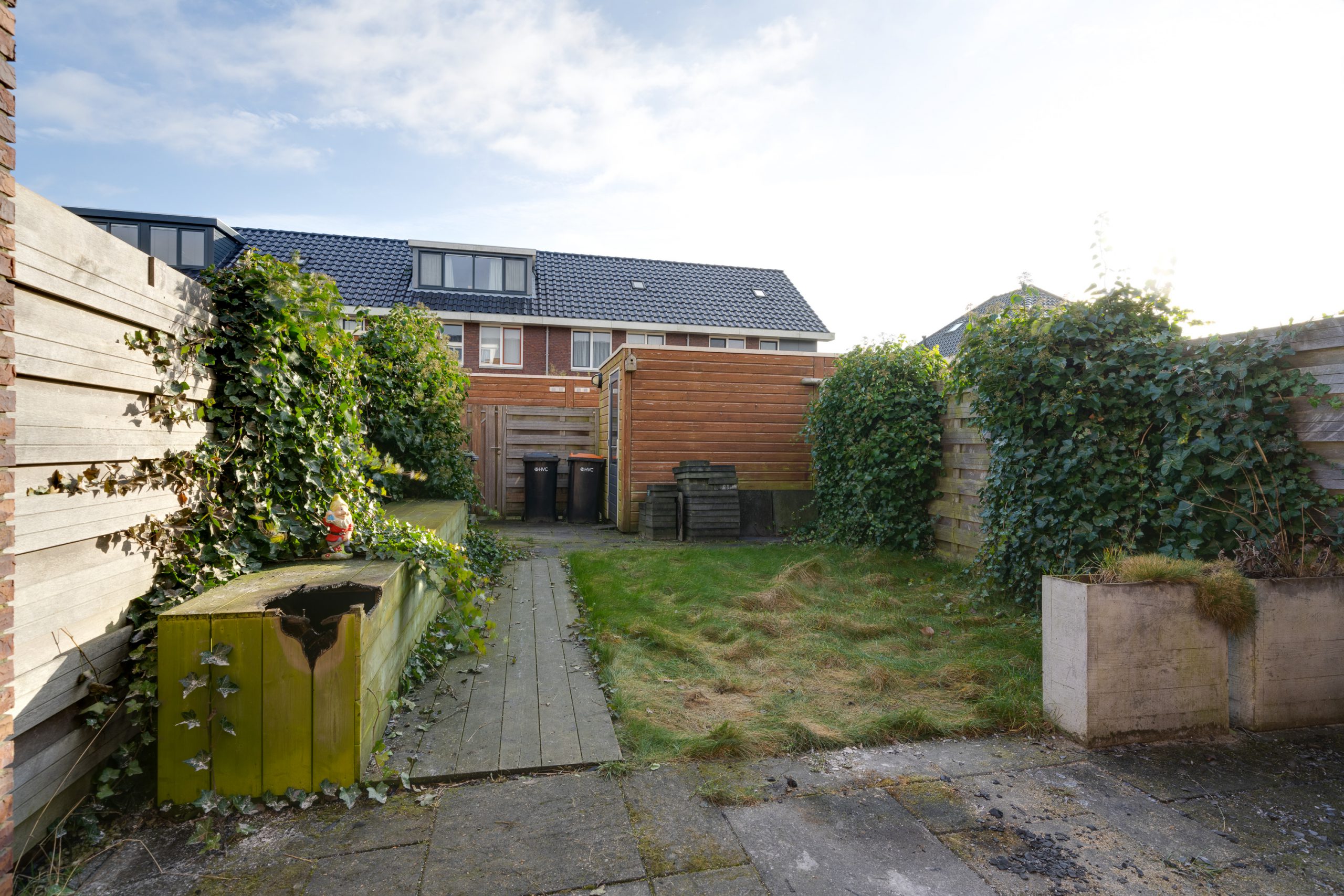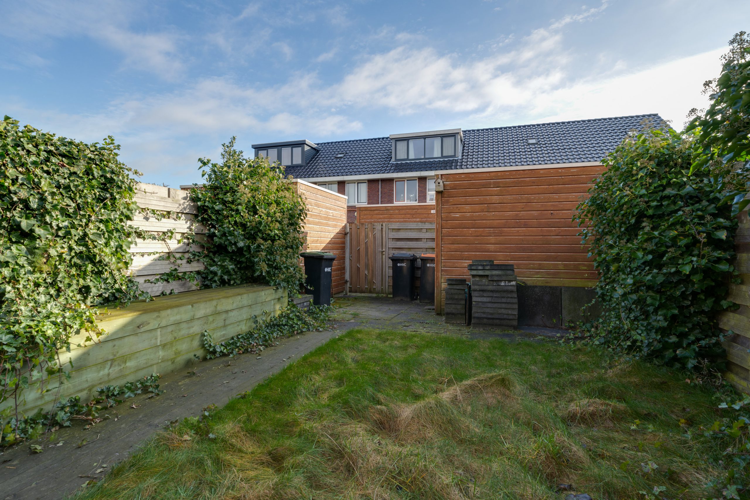 Begane grond: Entree met trapopgang naar 1e verdieping, meterkast (9 groepen en 2 aardlekschakelaars), nette betegelde toilet voorzien van wandcloset en fonteintje, open keuken in hoekopstelling voorzien van hardstenen aanrechtblad en diverse inbouwapparatuur en een tuingerichte woonkamer voorzien van trapkast en deur naar het achtererf. Gehele verdieping voorzien van PVC vloer. Op het achtererf staat een vrijstaande berging.