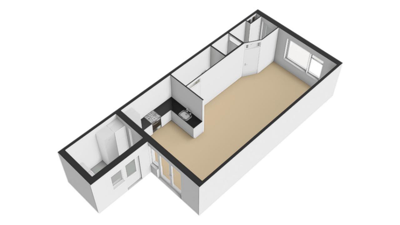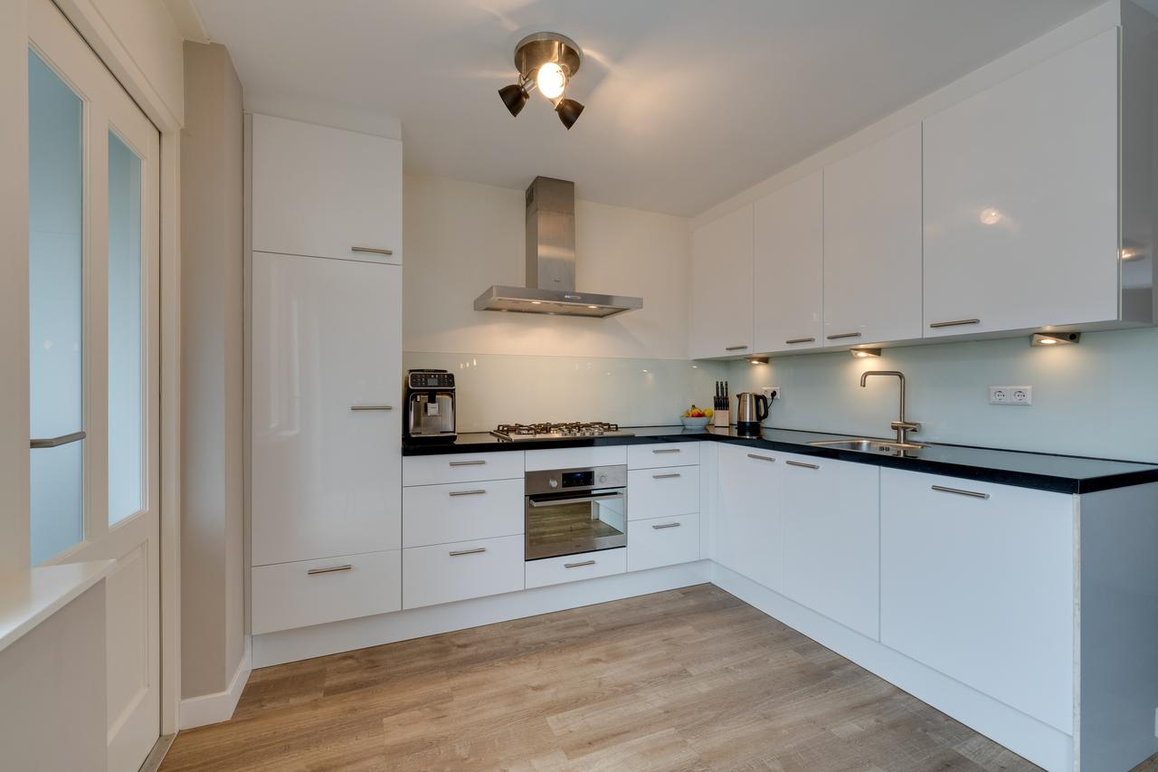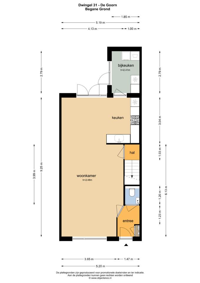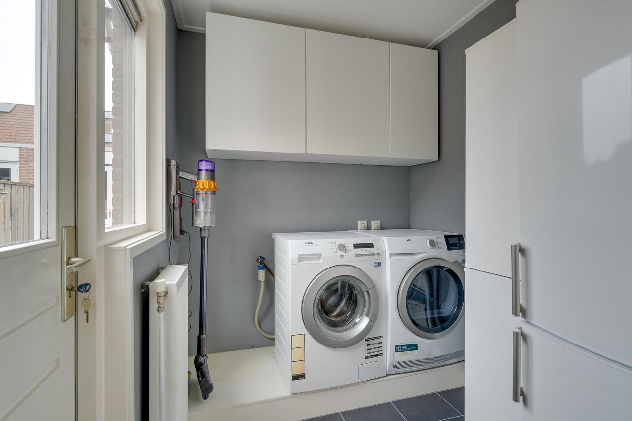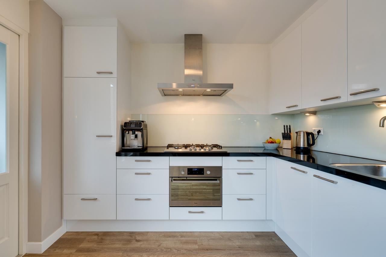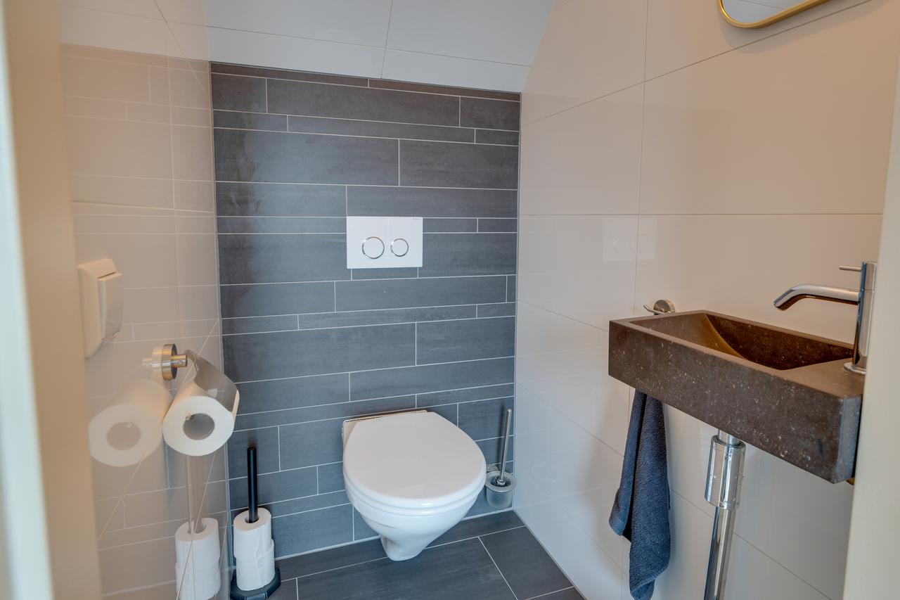 Begane grond: Entree, meterkast (9 groepen, 1 kookgroep en 2 aardlekschakelaars), luxe betegelde toilet voorzien van wandcloset en fonteintje, woonkamer met openslaande deuren naar het achtererf en gesloten trapopgang naar 1e verdieping, open luxe keuken in hoekopstelling voorzien van hardstenen aanrechtblad en diverse inbouwapparatuur en een aangebouwde bijkeuken voorzien van wasmachine aansluiting, inbouwkast en deur naar het achtererf. In de woning is de begane grond voorzien van een luxe PVC vloerafwerking met vloerverwarming. Op het achtererf een stenen berging met een aangebouwde houten overkapping.