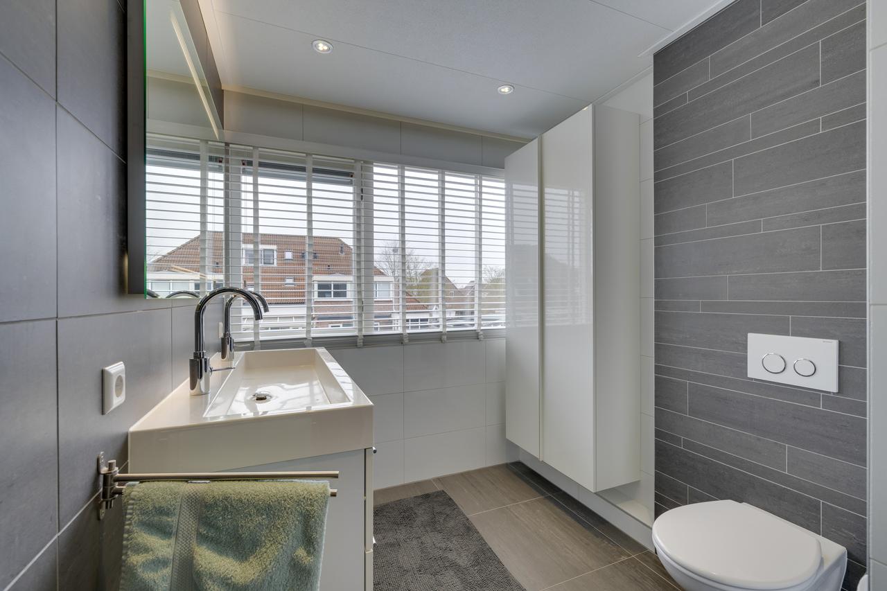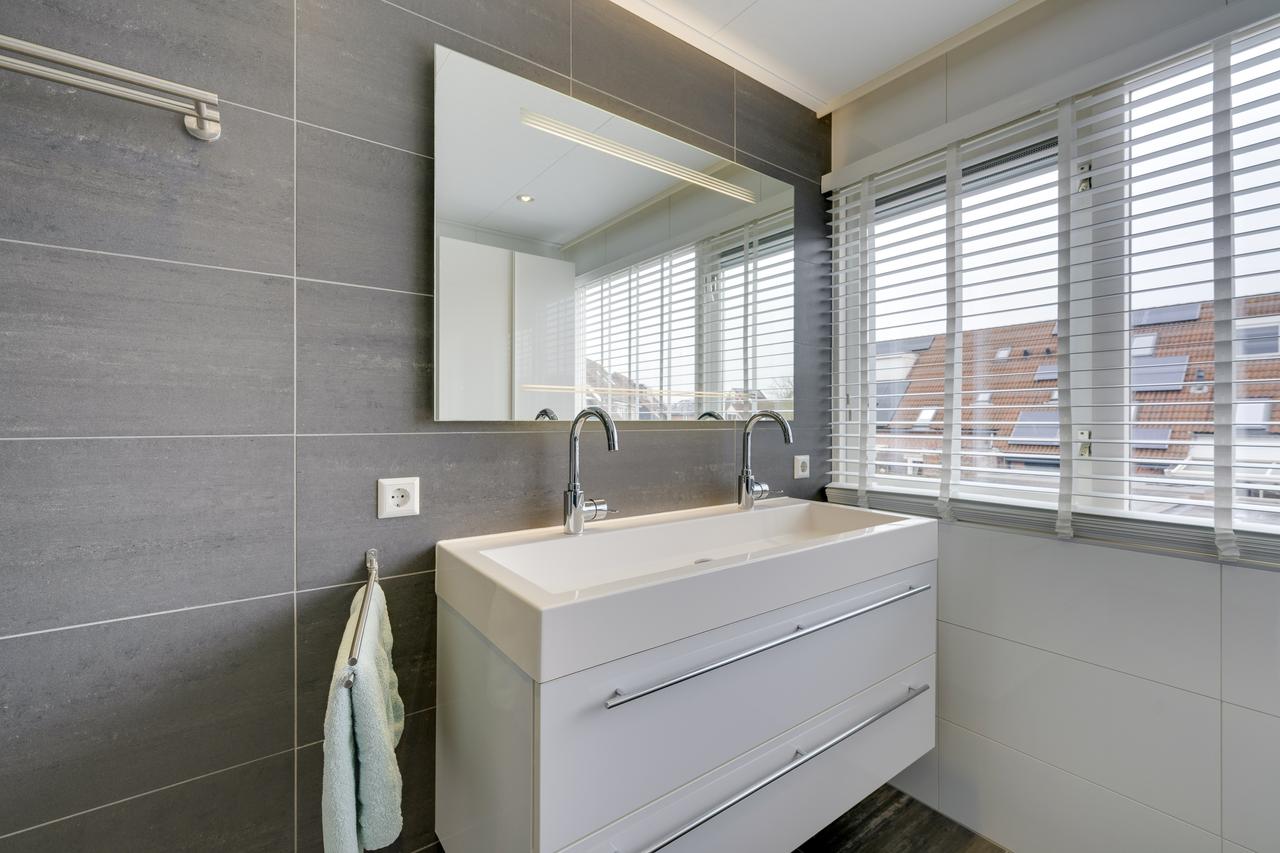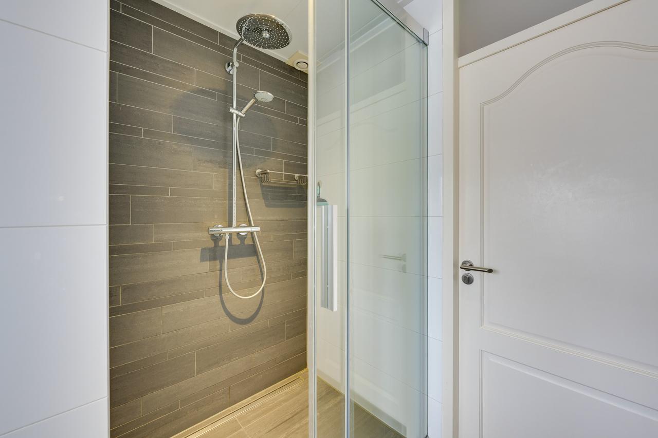 1e verdieping: Overloop met vaste trap naar 2e verdieping, luxe betegelde badkamer voorzien van badmeubel, wandcloset, douche en vloerverwarming, achterslaapkamer voorzien van schuifkastjes in schuinte en een voorslaapkamer. De gehele verdieping is voorzien van laminaatvloer.