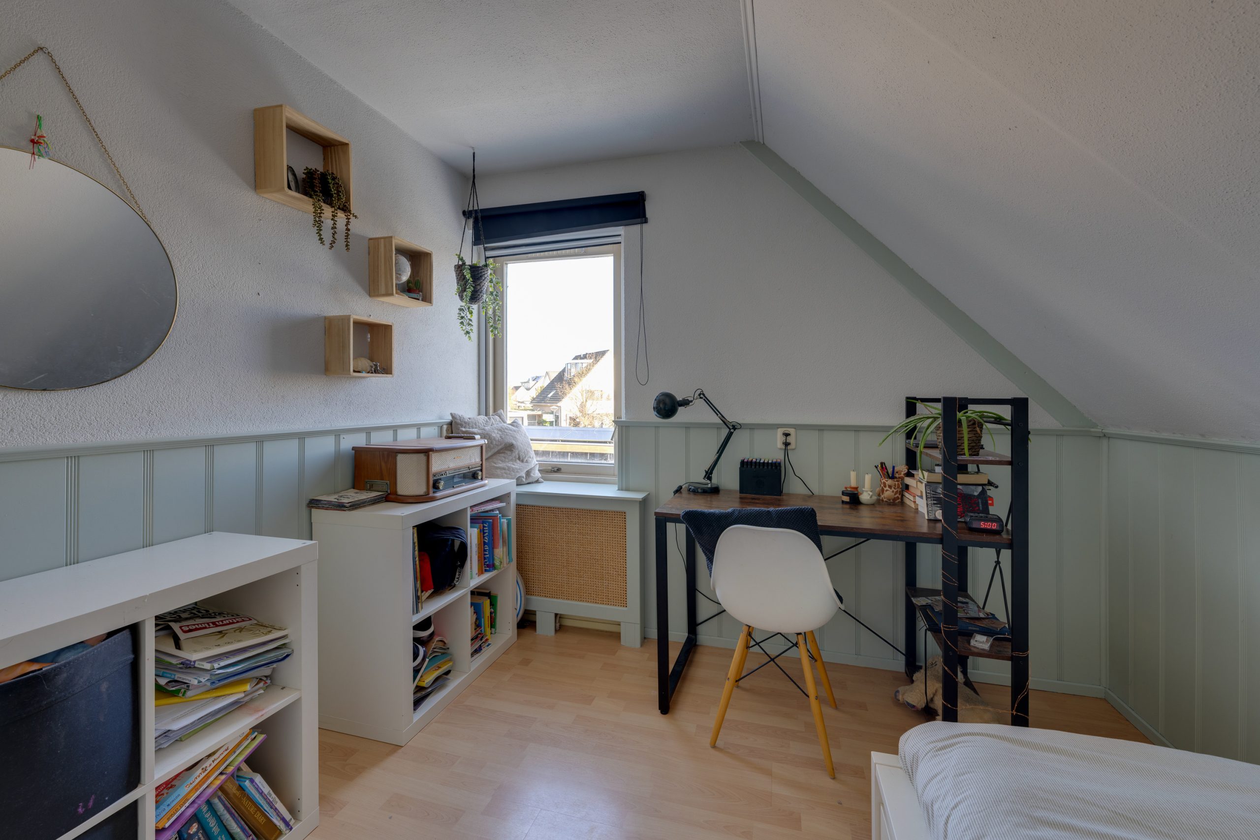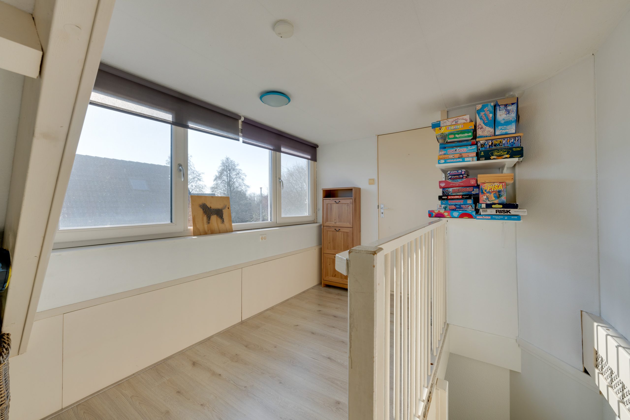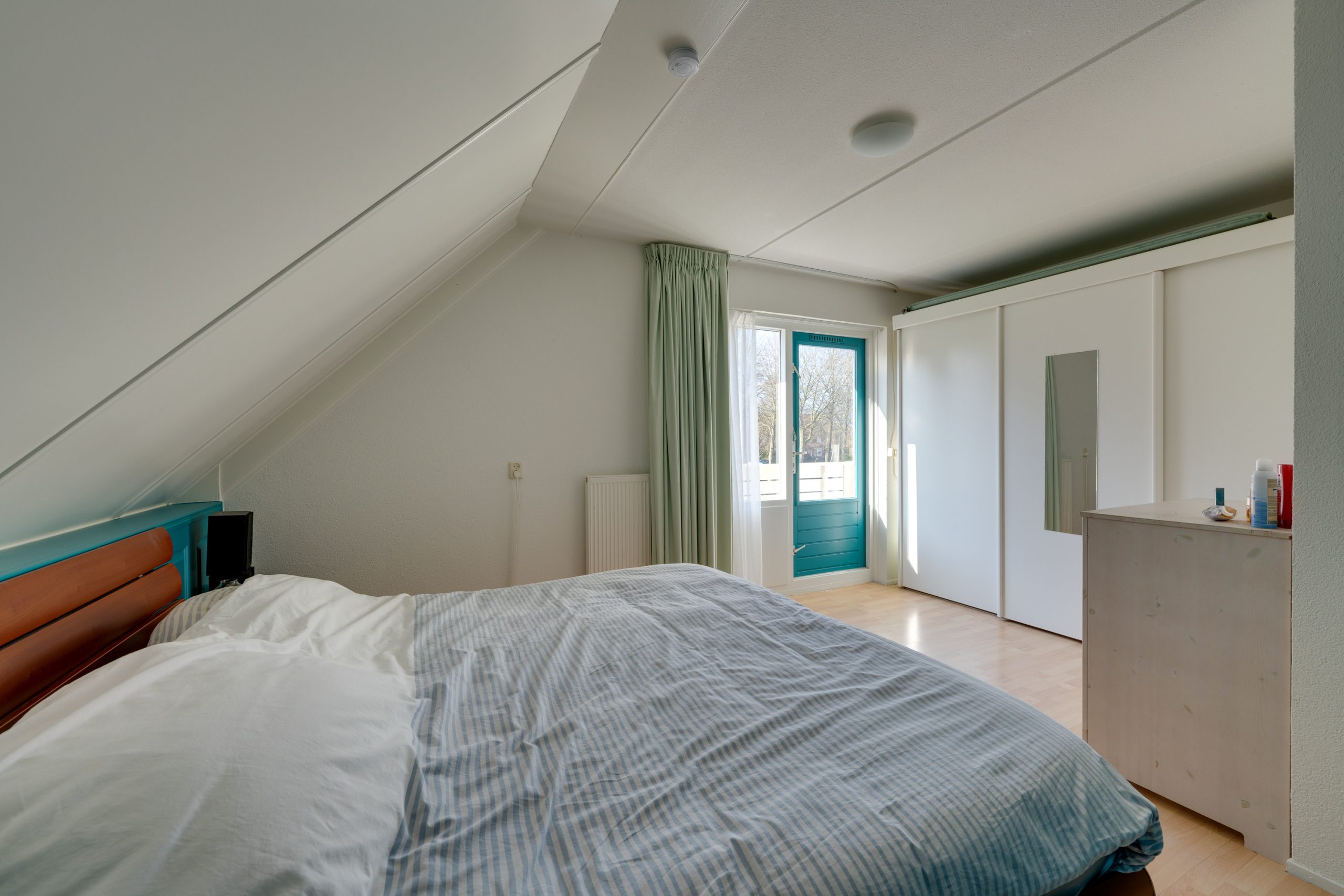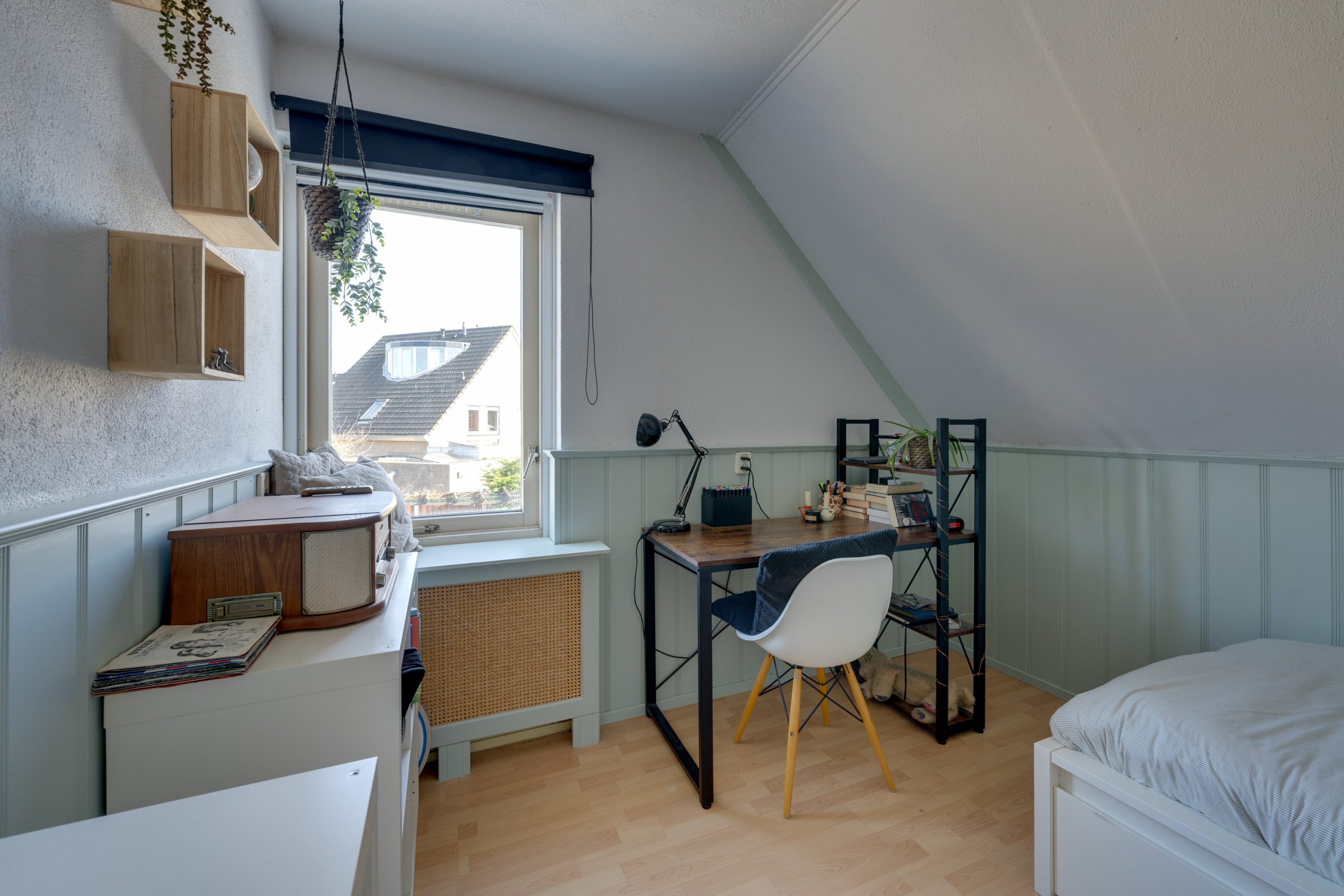 2e verdieping: Overloop met bergruimte achter knieschotten en CV ketel (Intergas uit 2021) en een slaapkamer voorzien van bergruimte achter knieschotten en kunststof dakkapel. De gehele verdieping is voorzien van laminaatvloer.