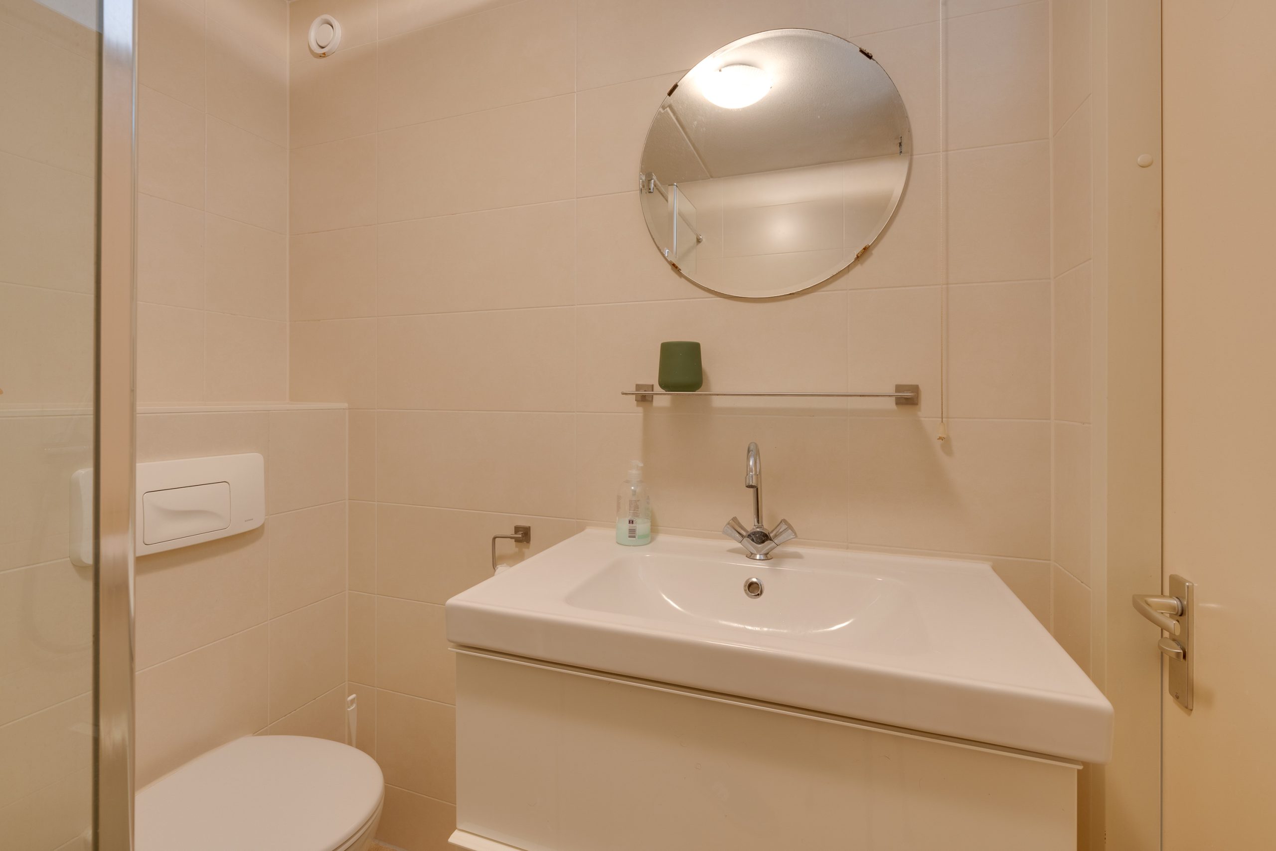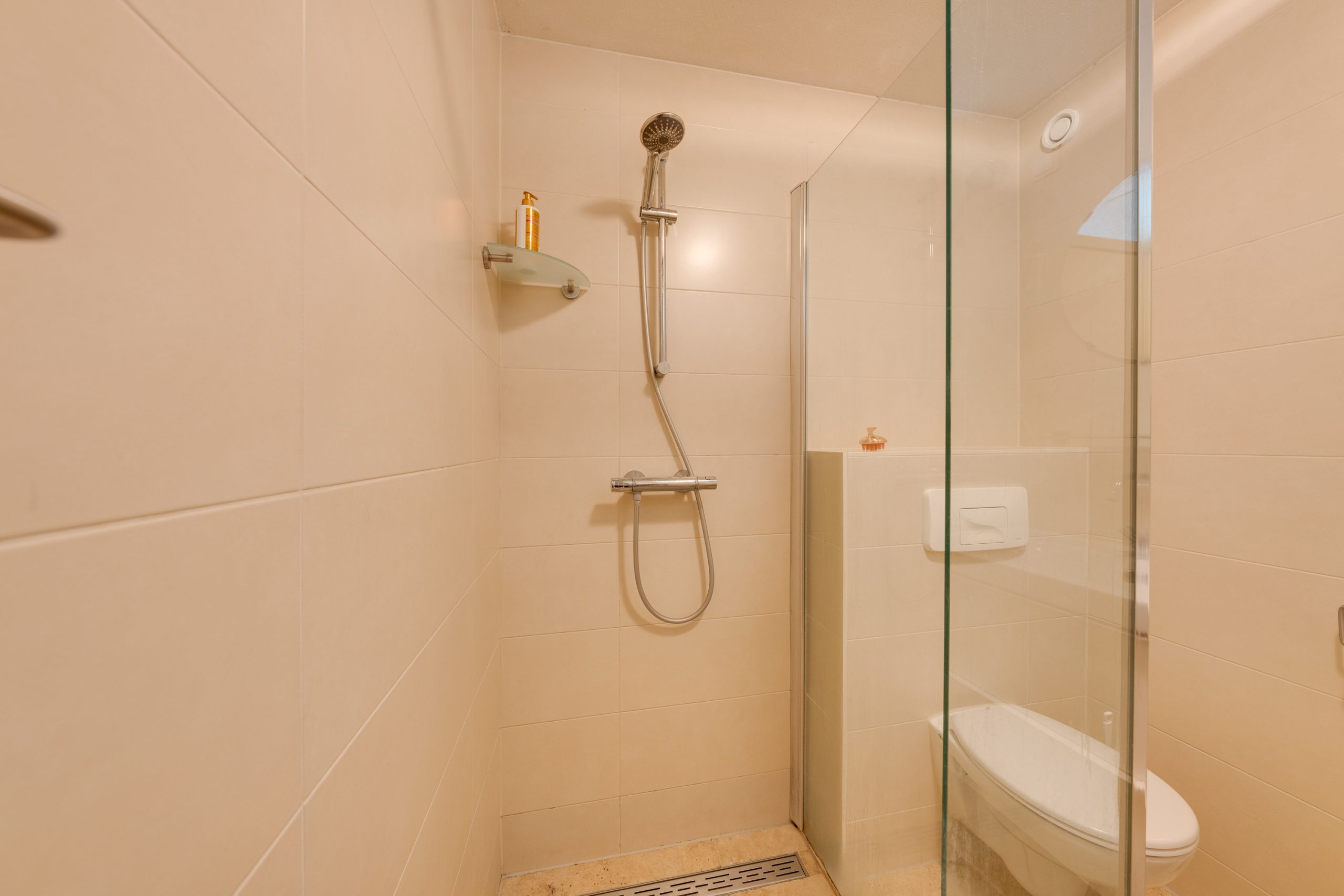 1e verdieping: Overloop met vaste trap naar 2e verdieping, twee achterslaapkamers, voorslaapkamer voorzien van schuifkastenwand en deur naar het balkon met elektrisch rolluik en een nette betegelde badkamer voorzien van badmeubel, wandcloset en inloopdouche. De gehele verdieping is voorzien van laminaatvloer.