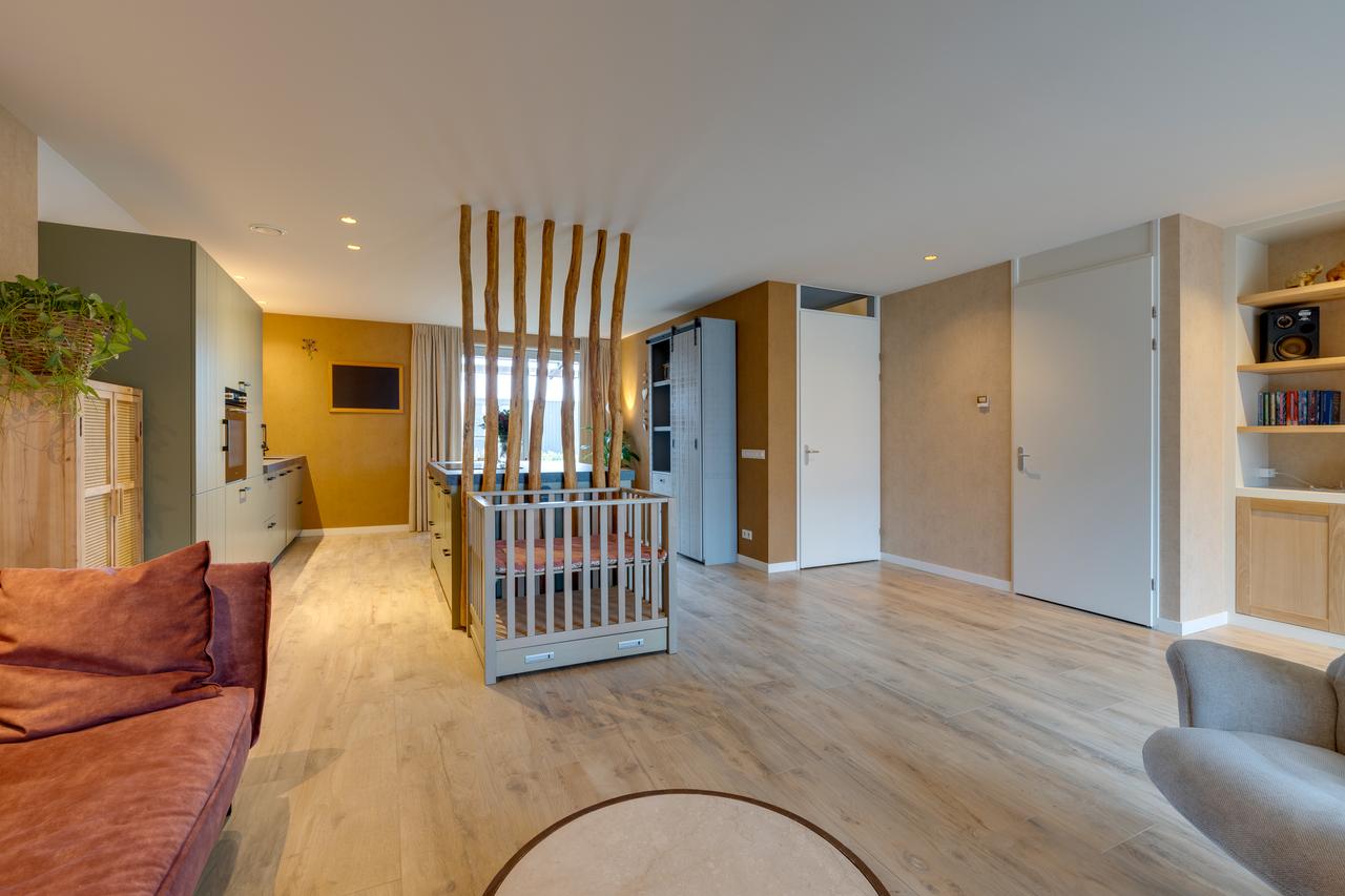 Begane grond: Entree met trapopgang naar 1e verdieping (met lades in trap), meterkast (7 groepen, 1 kookgroep en 3 aardlekschakelaars), luxe deels betegelde toilet met wandcloset en fonteintje, open woonkeuken met openslaande deuren, eiland voorzien van keramiek aanrechtblad, diverse inbouwapparatuur en openslaande deuren naar het voorerf en een tuingerichte woonkamer met trapkast, schuifpui naar het achtererf en een aangebouwde serre en tuinkast. Aan de voorzijde een berging en de gehele begane grond is voorzien van plavuizen (keramiek) met vloerverwarming.