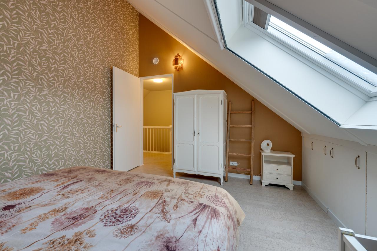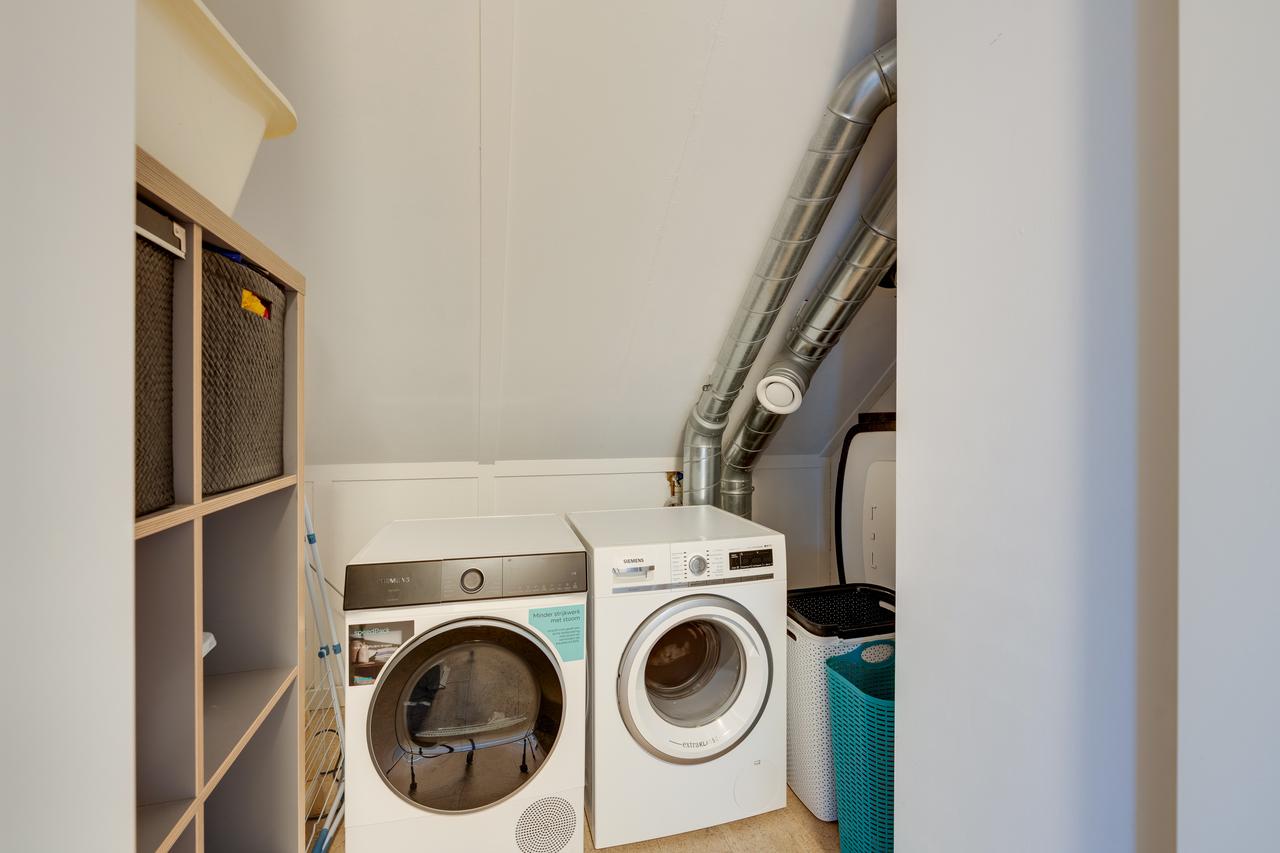 1e verdieping: Overloop, wasruimte voorzien van wasmachine aansluiting en WTW unit (Itho Daalderop uit 2023), voorslaapkamer voorzien van bergruimte achter knieschotten, achterslaapkamer voorzien van bergruimte achter knieschotten en een luxe betegelde badkamer voorzien van badmeubel, wandcloset en douche. De gehele verdieping is voorzien van kurk vloer met vloerverwarming.