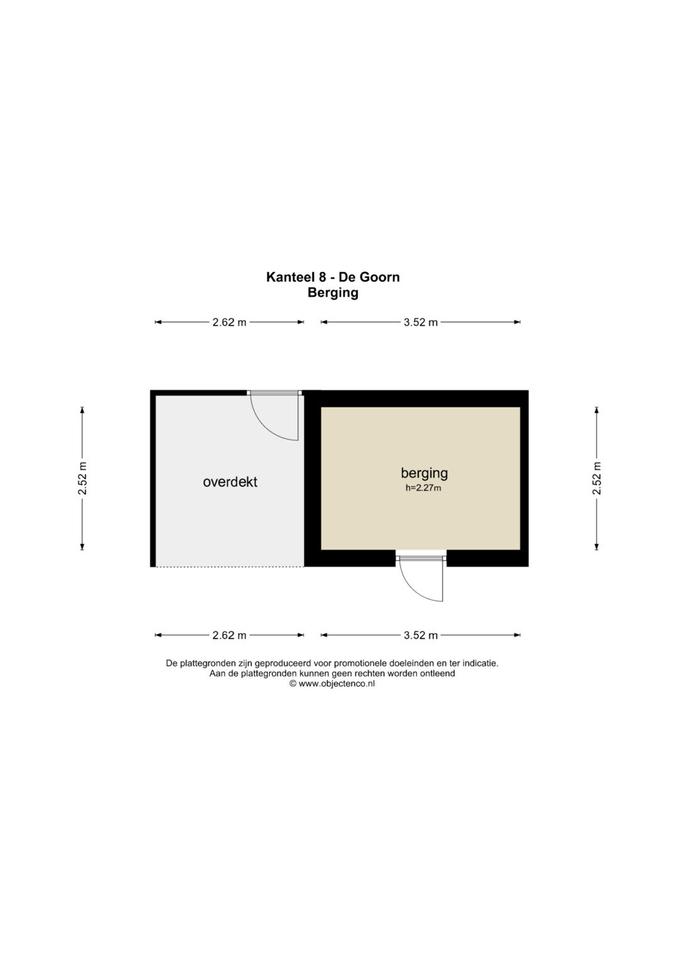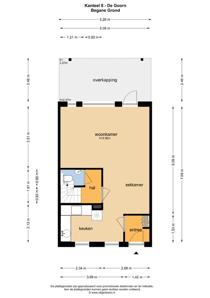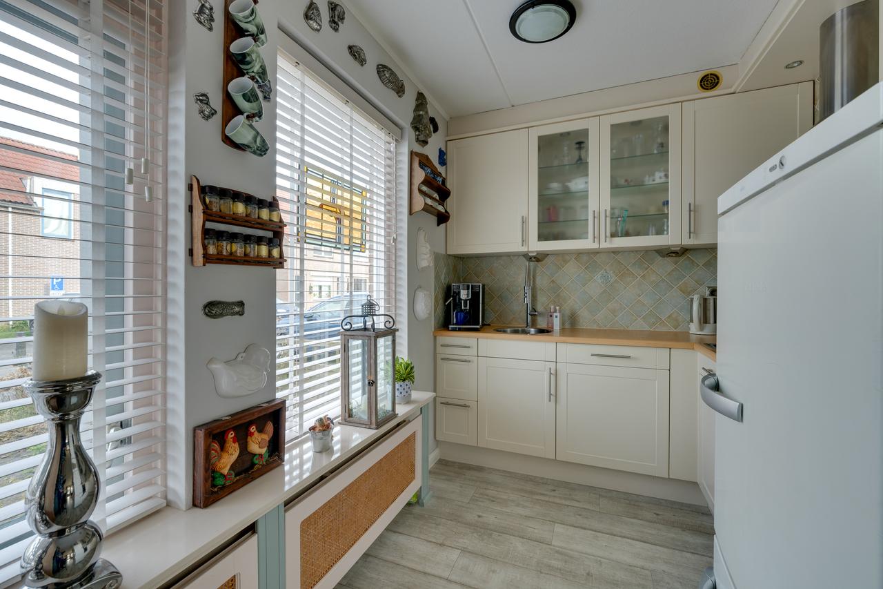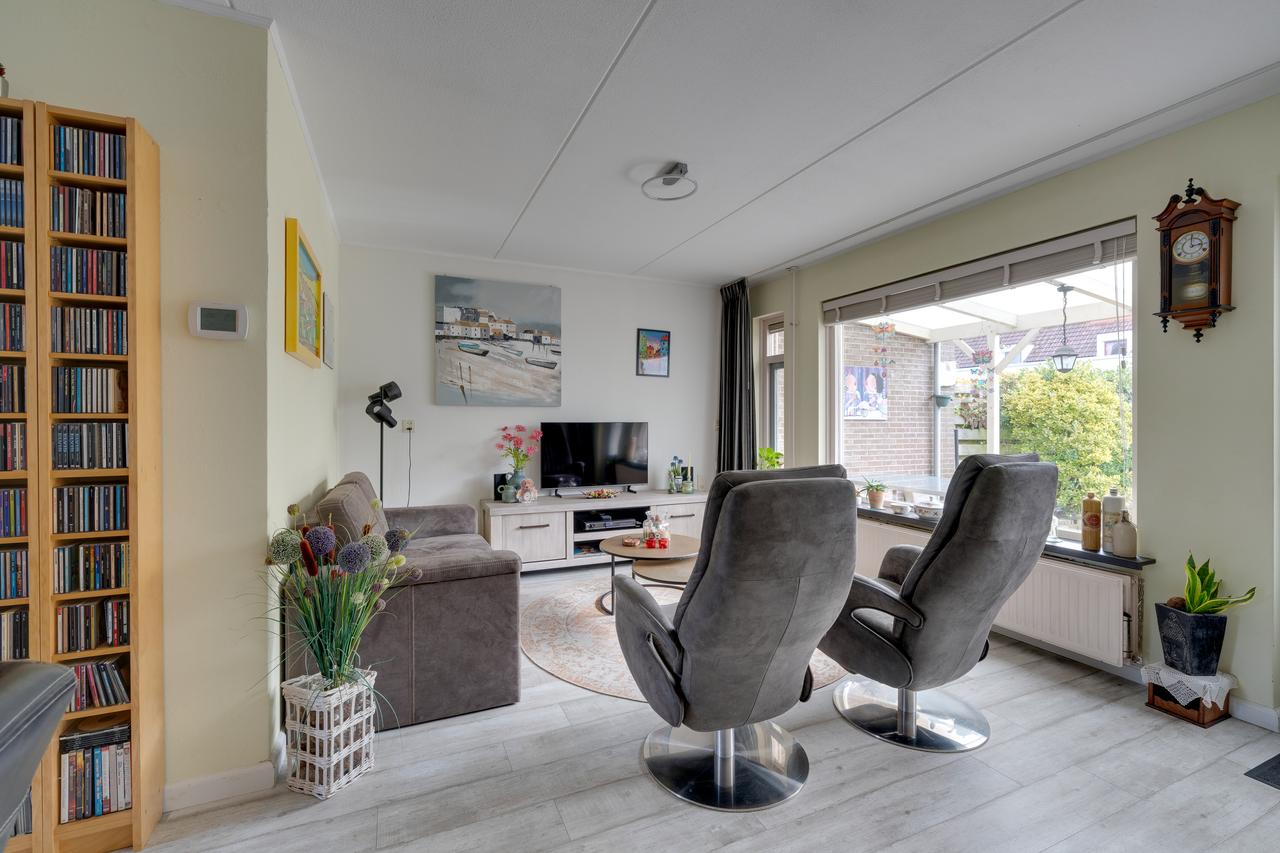 Begane grond: Entree, meterkast (6 groepen, 1 kookgroep en 2 aardlekschakelaars), open nette keuken in hoekopstelling voorzien van inbouwapparatuur, L-vormige tuingerichte woonkamer met deur naar het achtererf en voorzien van gesloten trapopgang met tochtportaal en nette betegelde toilet met wandcloset en fonteintje. Op het achtererf een aangebouwde overkapping en een vrijstaande berging met betonvloer en elektra.