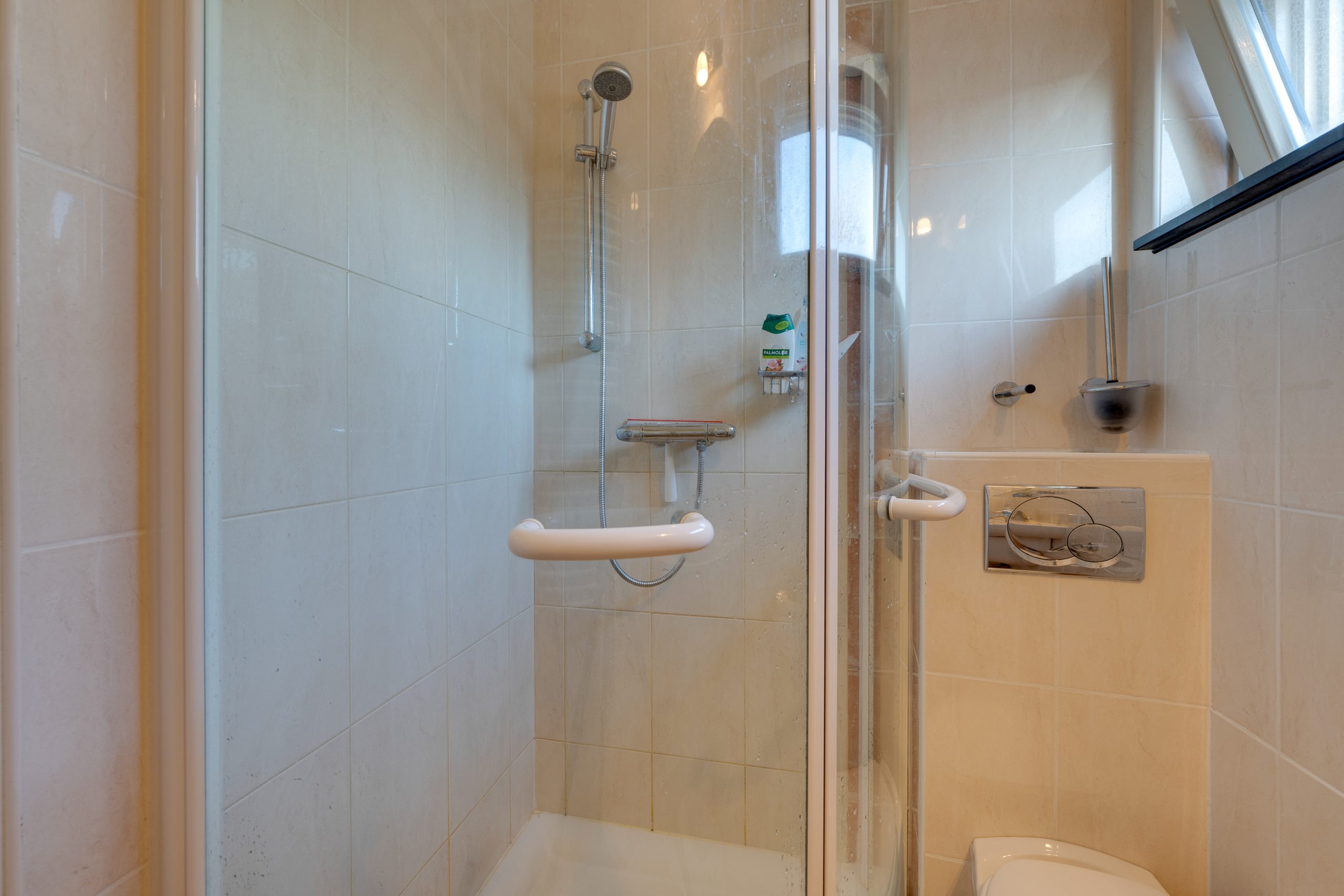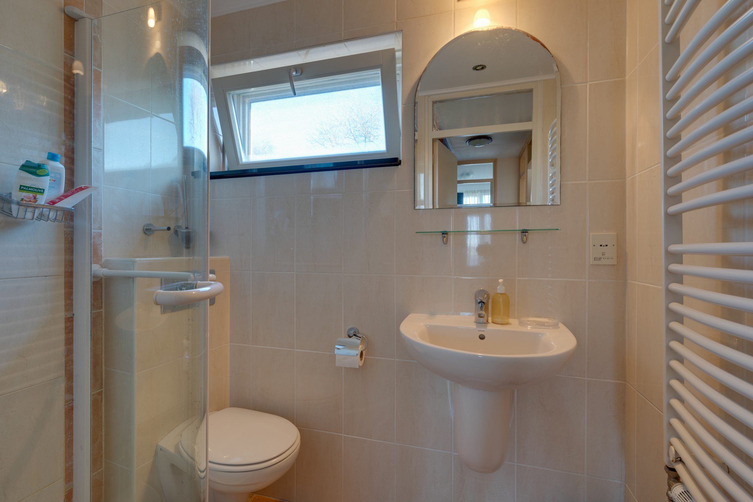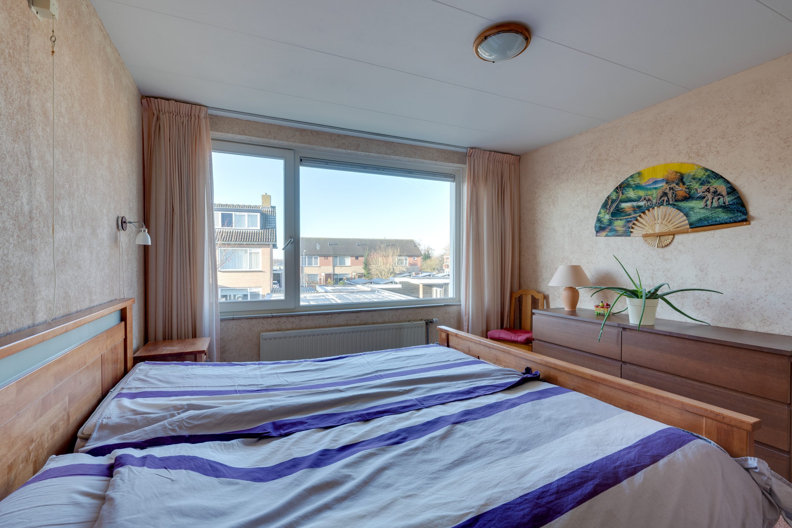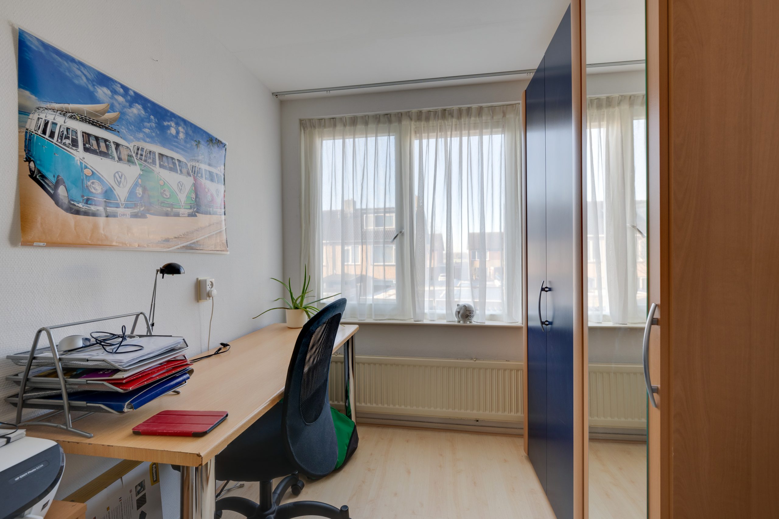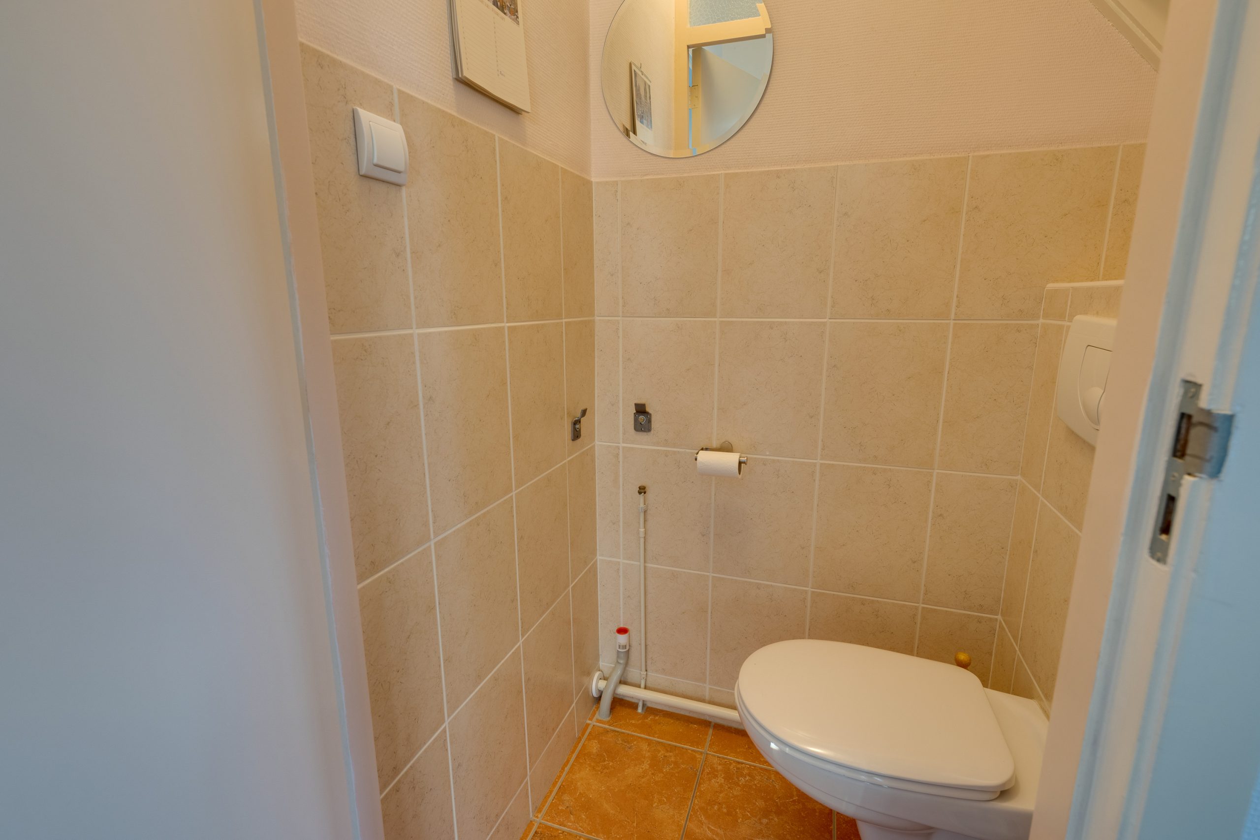 1e verdieping: overloop met vaste trap naar de 2e verdieping, 2 achterslaapkamers waarvan 1 met inbouwkast, voorslaapkamer met inbouwkast, geheel betegelde badkamer voorzien van douchecabine, toilet en wastafel.