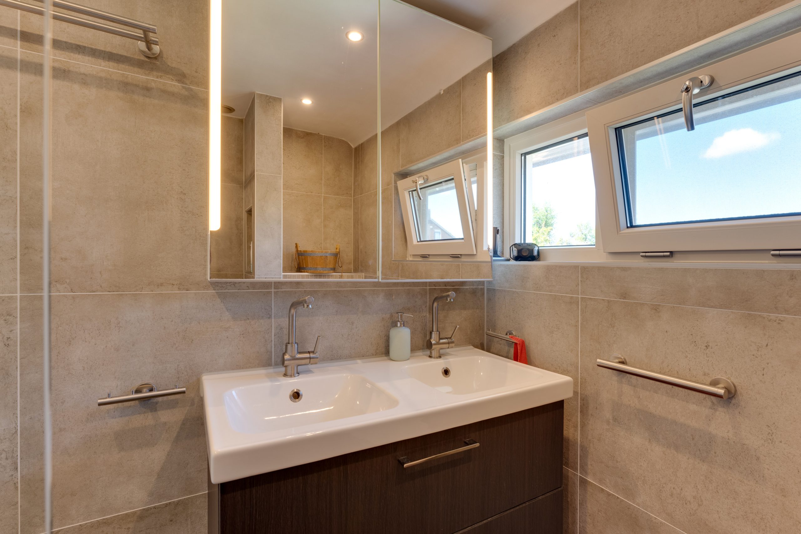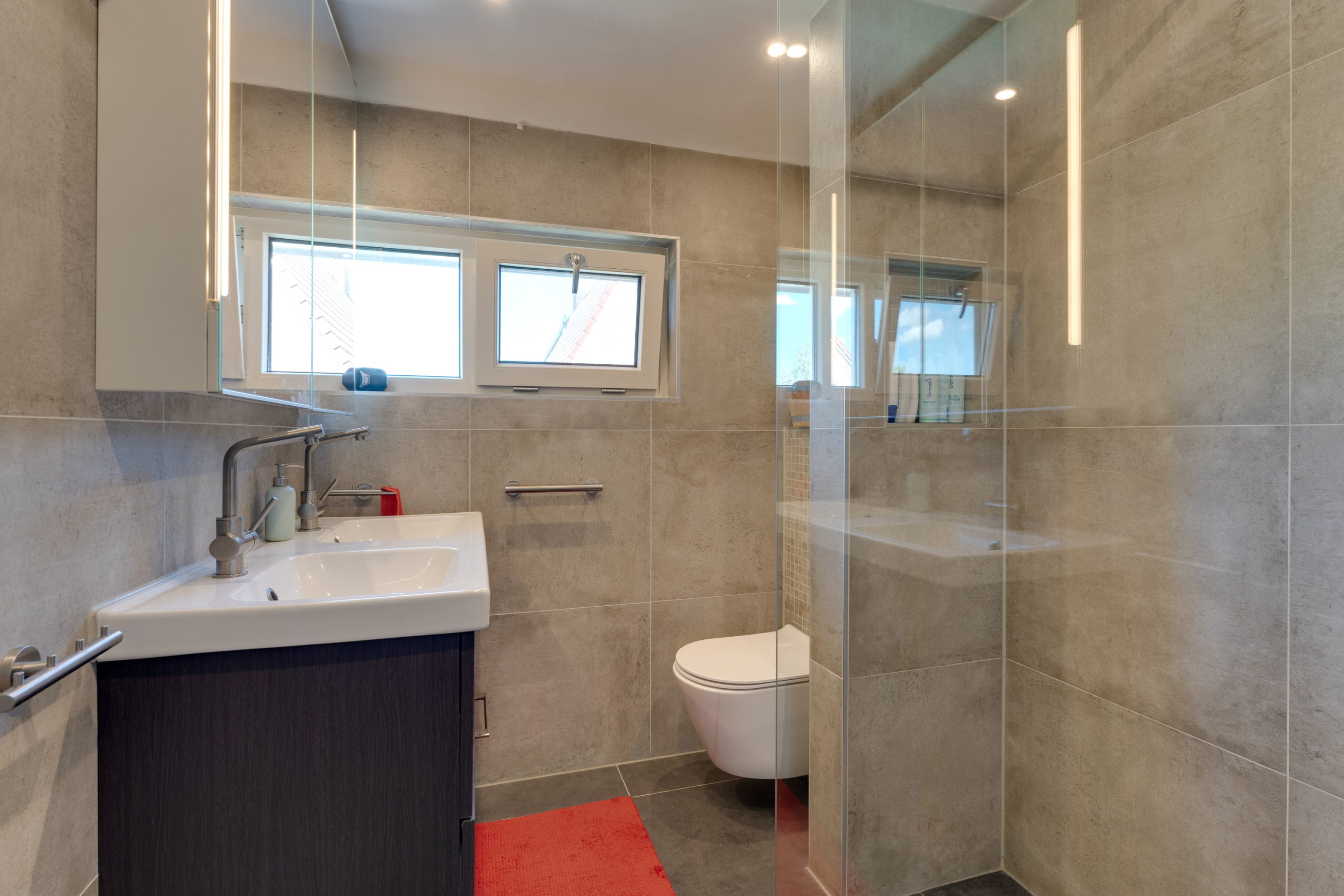 1e verdieping: Overloop met vaste trap naar 2e verdieping en laminaatvloer, luxe betegelde badkamer voorzien van badmeubel met dubbele wastafel, wandcloset, inloopdouche en elektrische vloerverwarming, voorslaapkamer, achterslaapkamer voorzien van laminaatvloer en een achterslaapkamer met linoleum en kastenwand.
