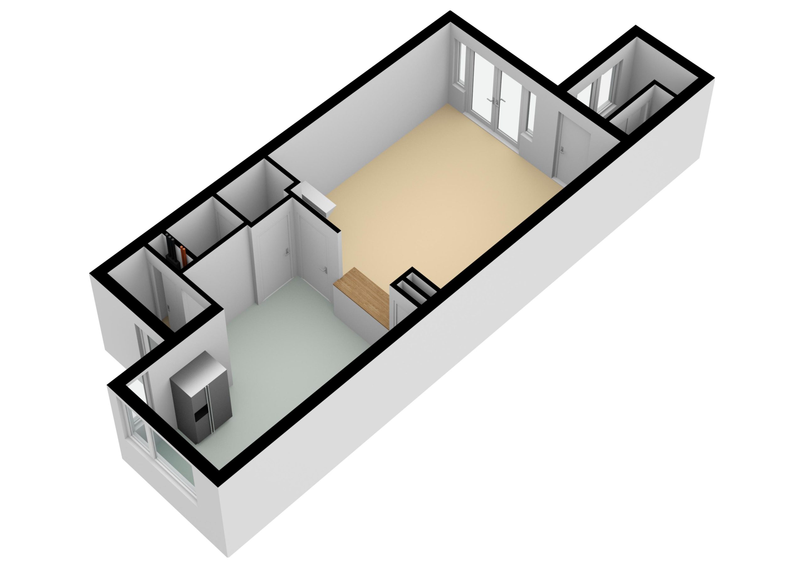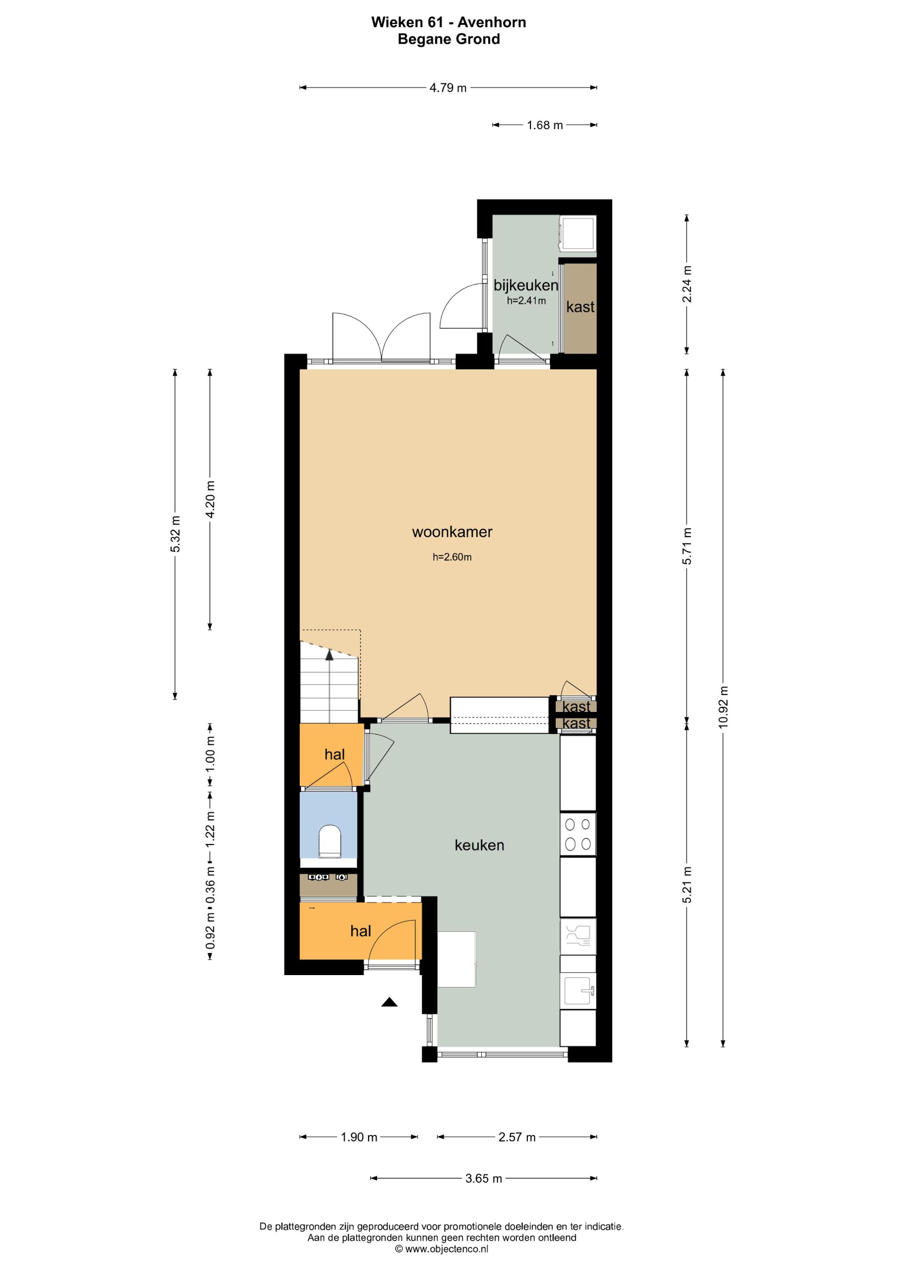 Begane grond: Entree, meterkast (10 groepen en 2 aardlekschakelaars), woonkeuken met keuken in rechte opstelling voorzien van diverse inbouwapparatuur, gesloten trapopgang met gang en nette betegelde toilet met staand toilet, tuingerichte woonkamer voorzien van trapkast en openslaande deuren naar het achtererf en een aangebouwde bijkeuken voorzien van wasmachine aansluiting, schuifkastenwand met gootsteen en deur naar het achtererf. Op het achtererf een vrijstaande berging voorzien van elektra.