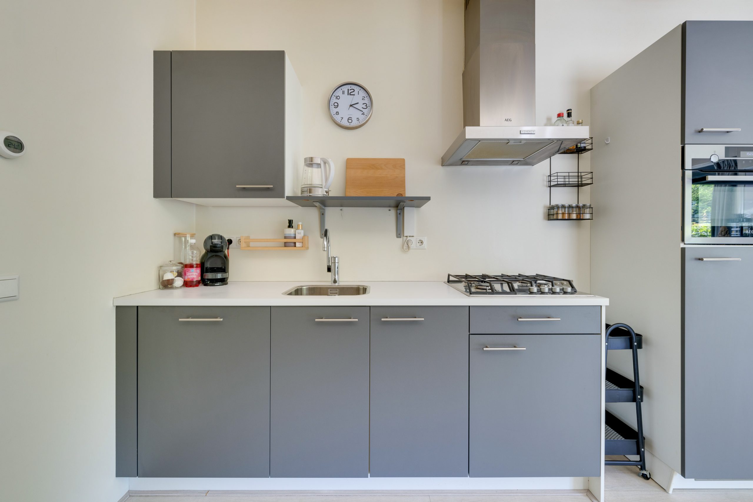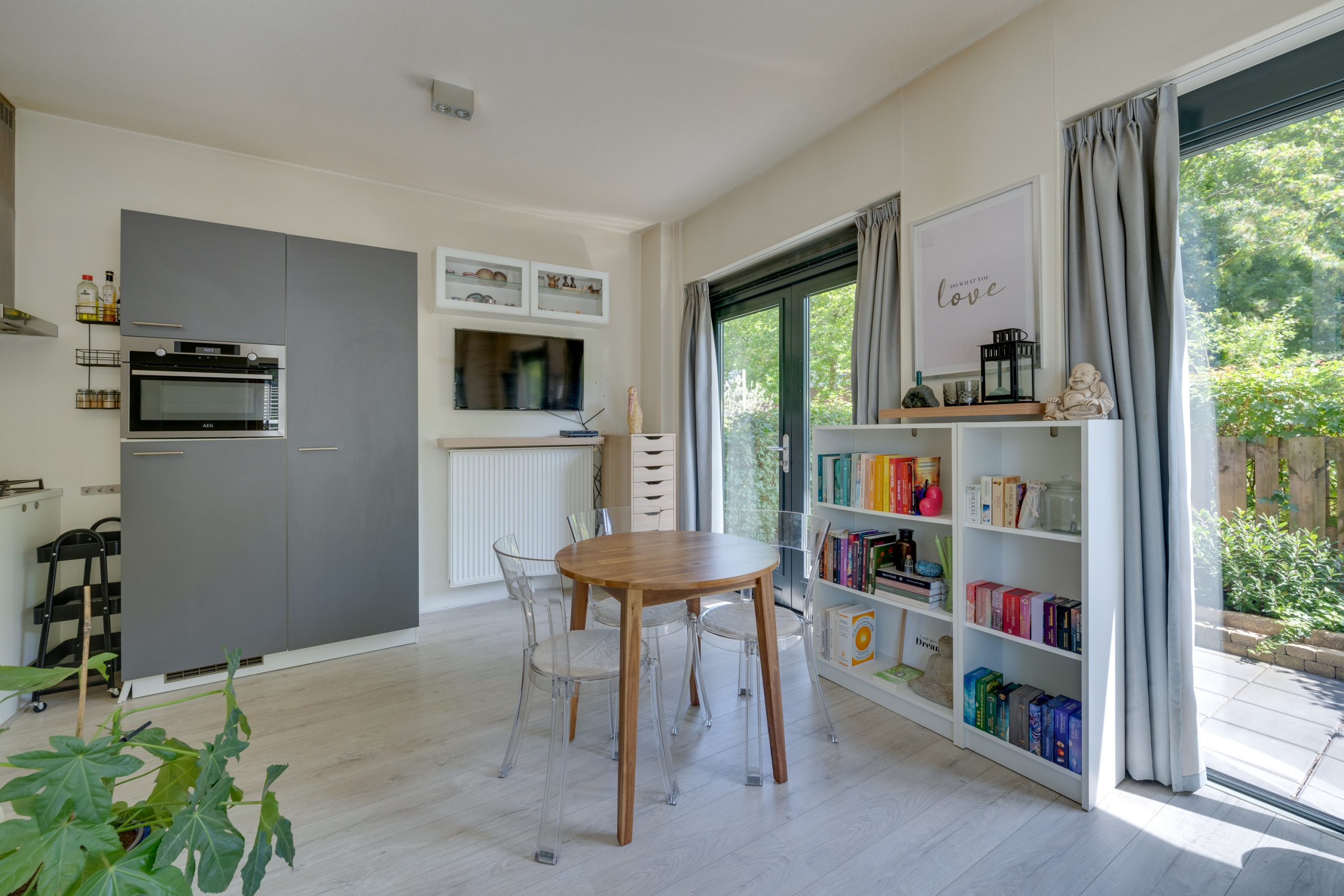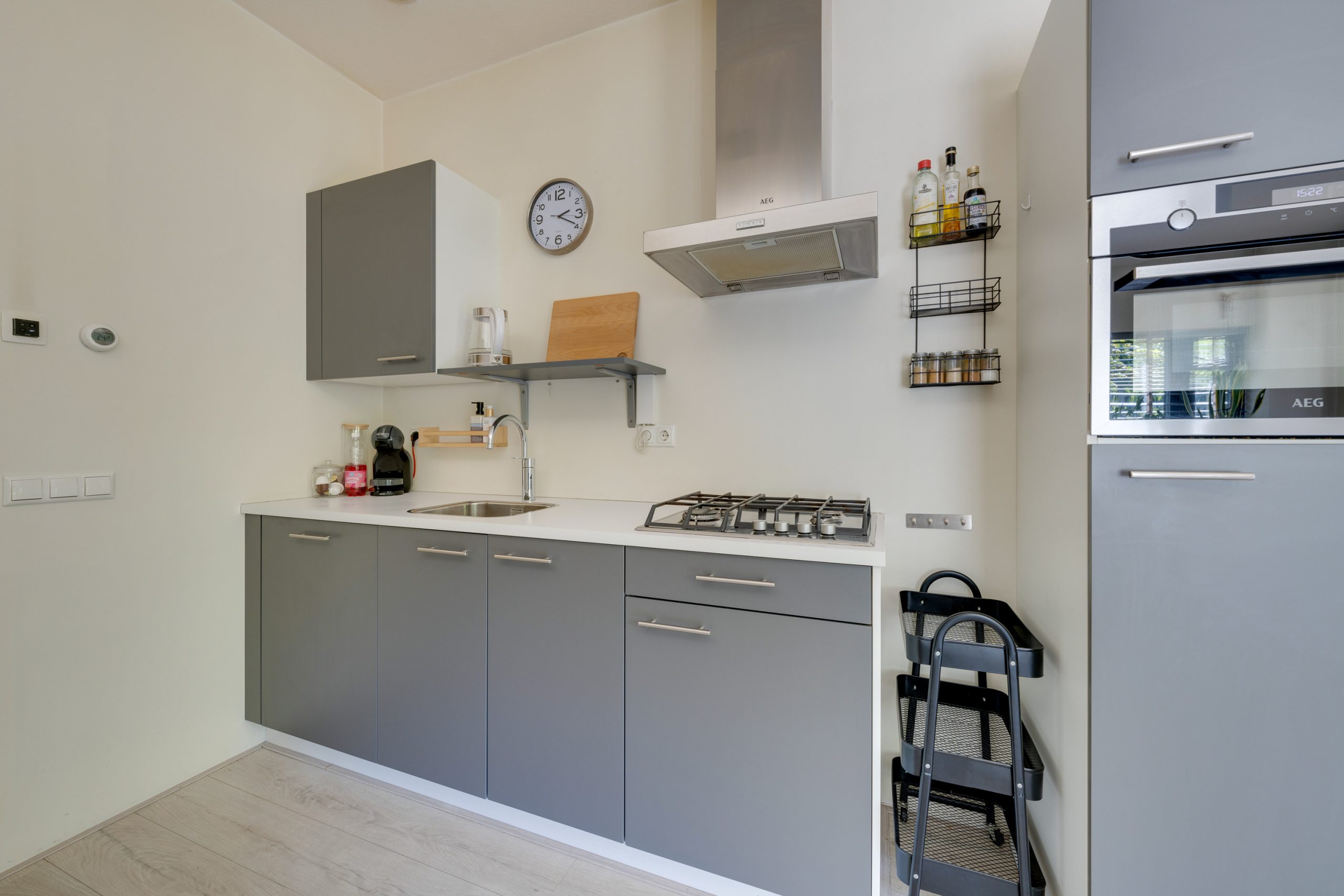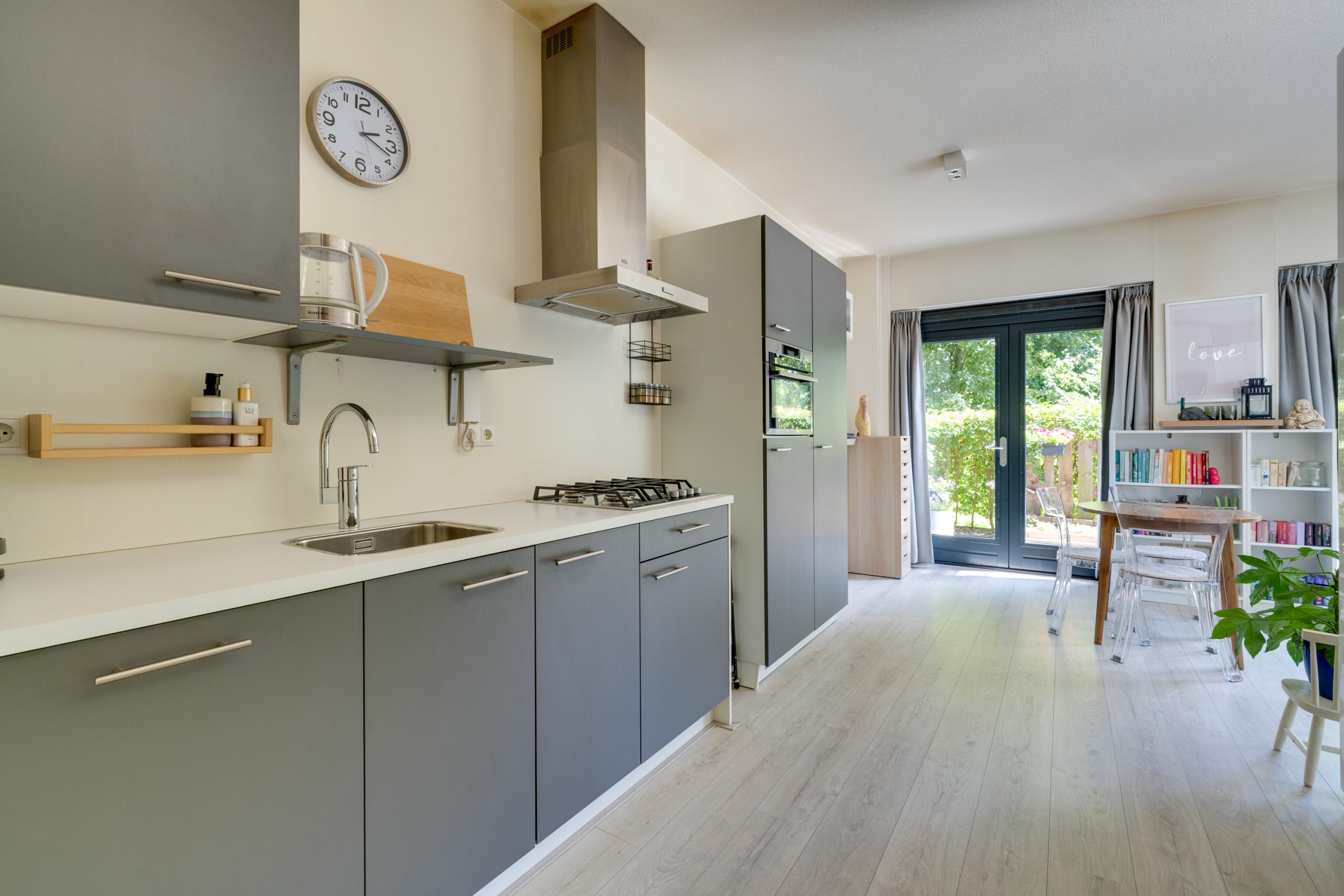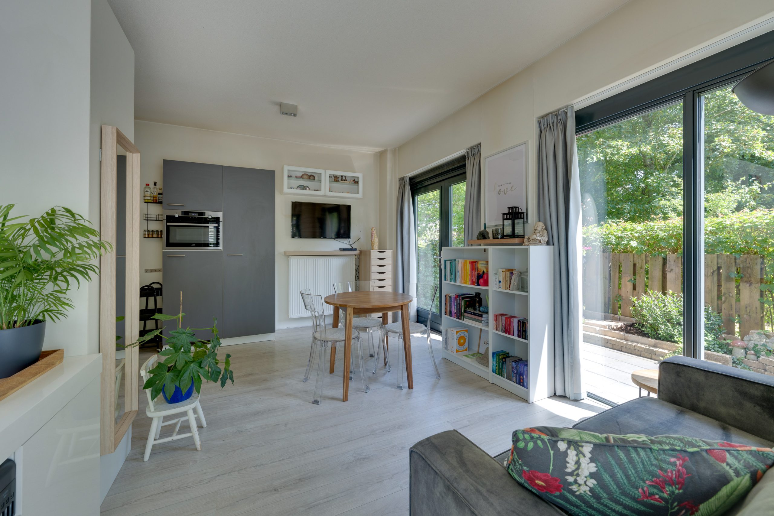 INDELING: Entree, meterkast (4 groepen en 2 aardlekschakelaars), wasruimte voorzien van wasmachine aansluiting, CV ketel (Intergas uit 2017) en ventilatieunit, luxe half betegelde toilet voorzien van wandcloset en fonteintje, luxe betegelde badkamer voorzien van wastafel en douchecabine, open keuken in rechte opstelling voorzien van vaatwasser, gasfornuis, afzuigkap, combi-oven en een koel-/vriescombinatie en een woonkamer/slaapkamer voorzien van openslaande deuren naar de tuin. Het gehele appartement is voorzien van laminaatvloer. Daarnaast is er de beschikking over een separate gezamenlijke berging.