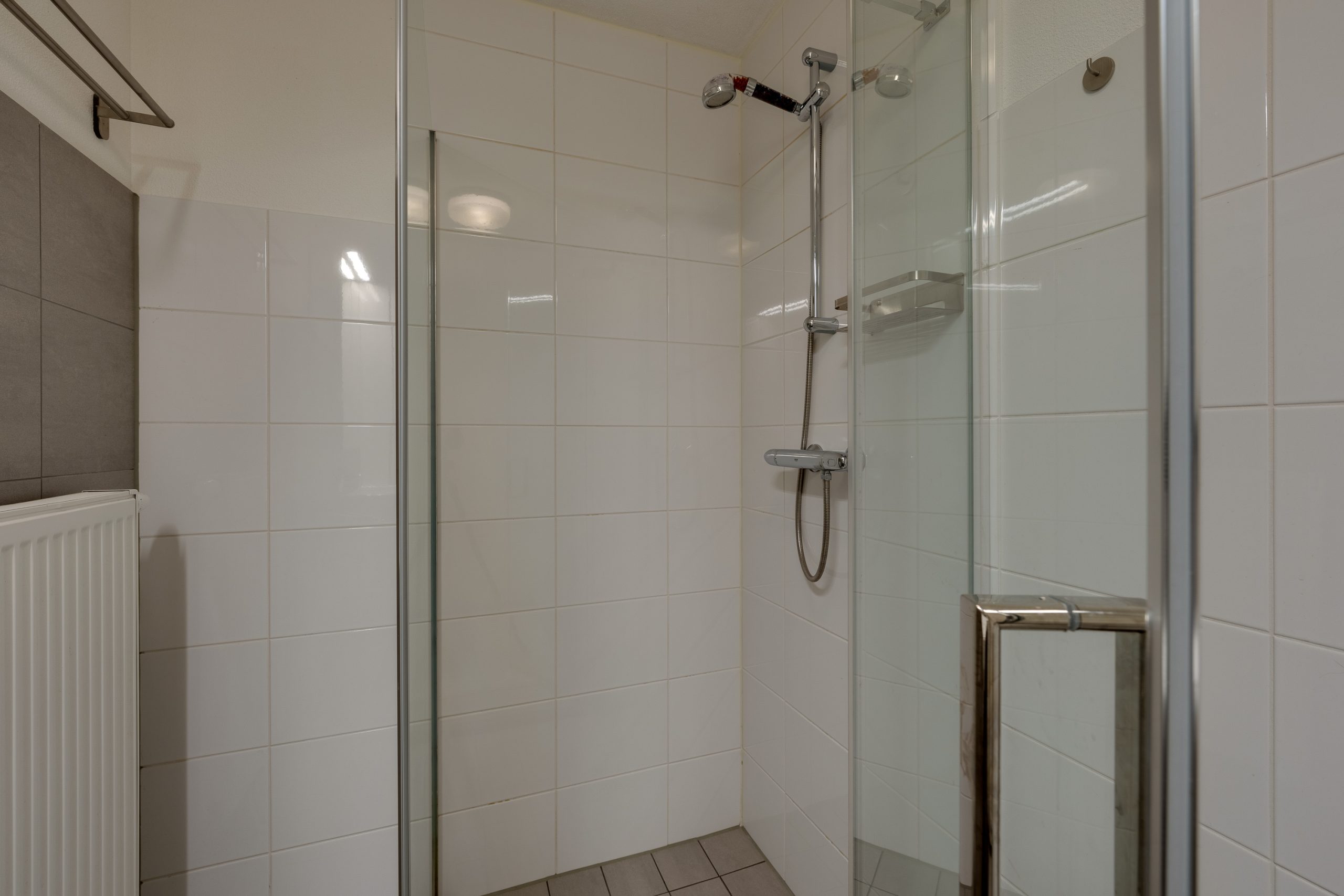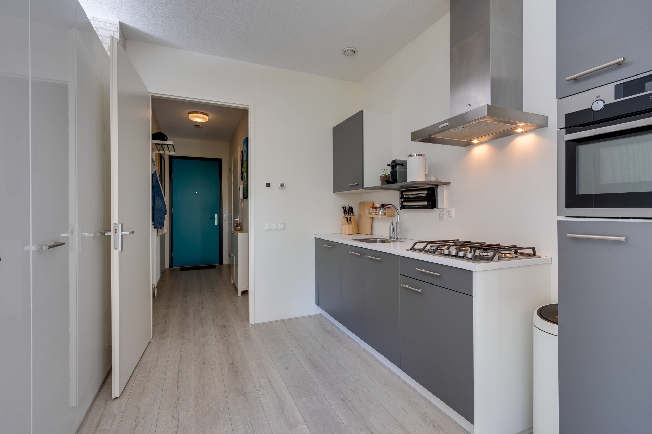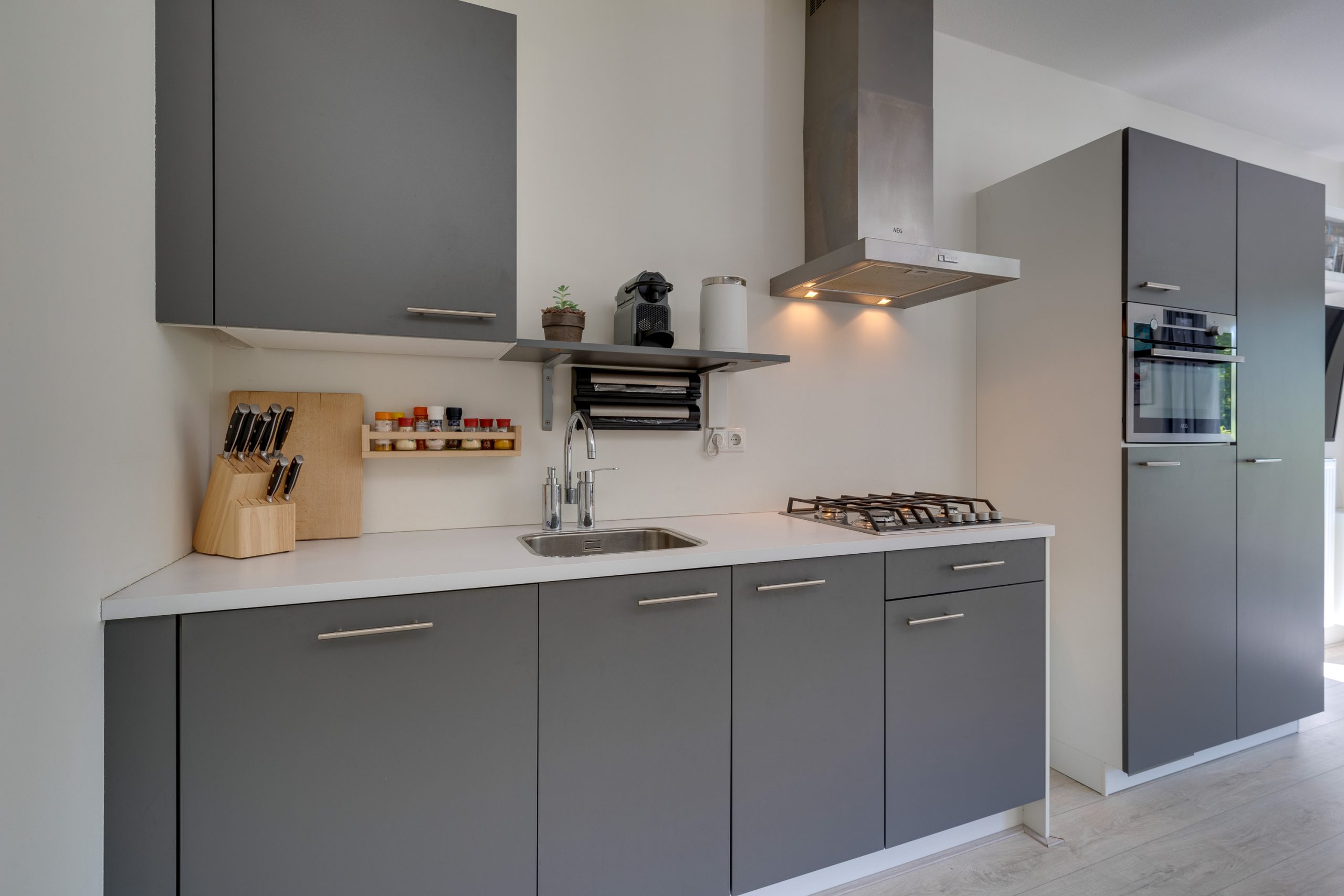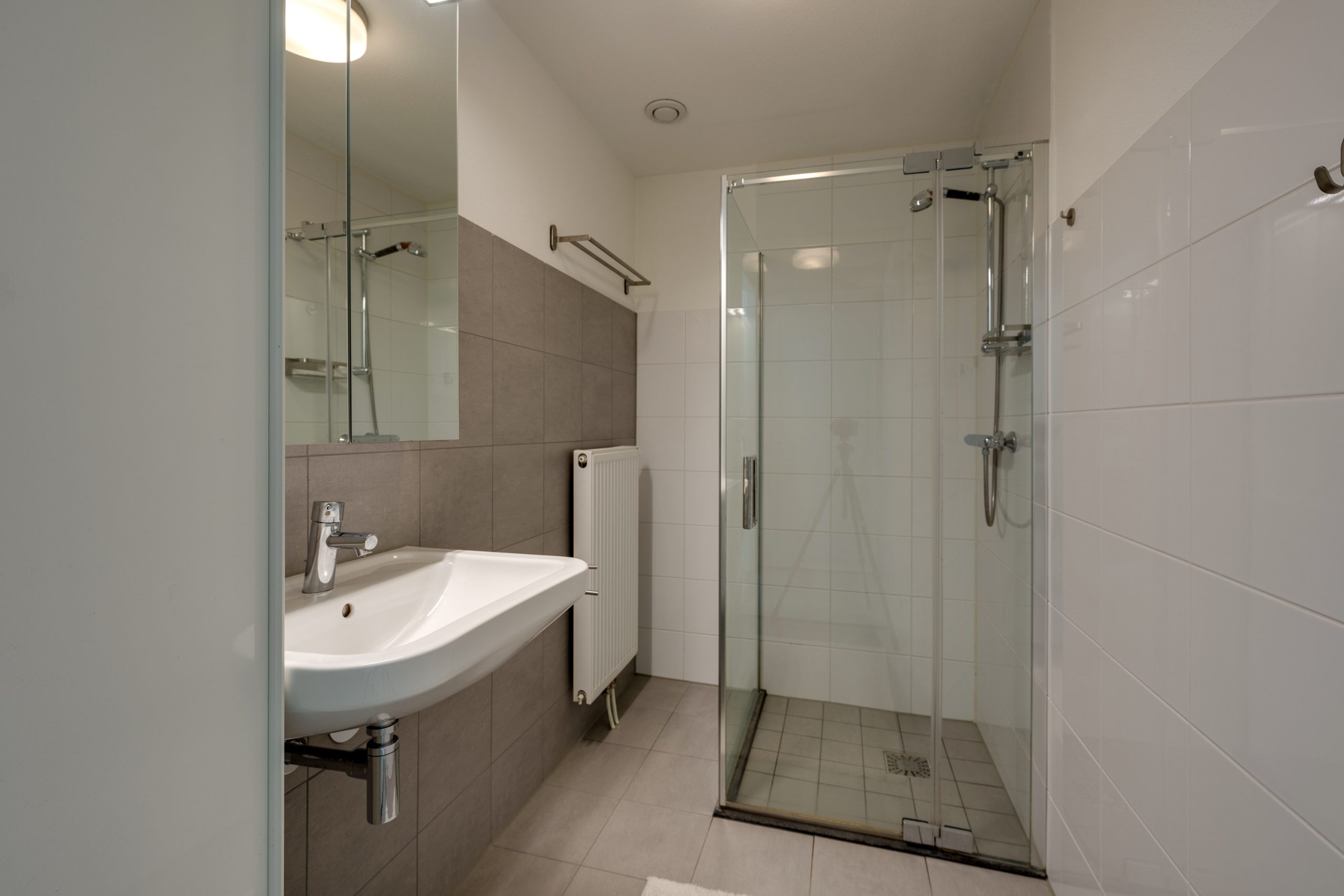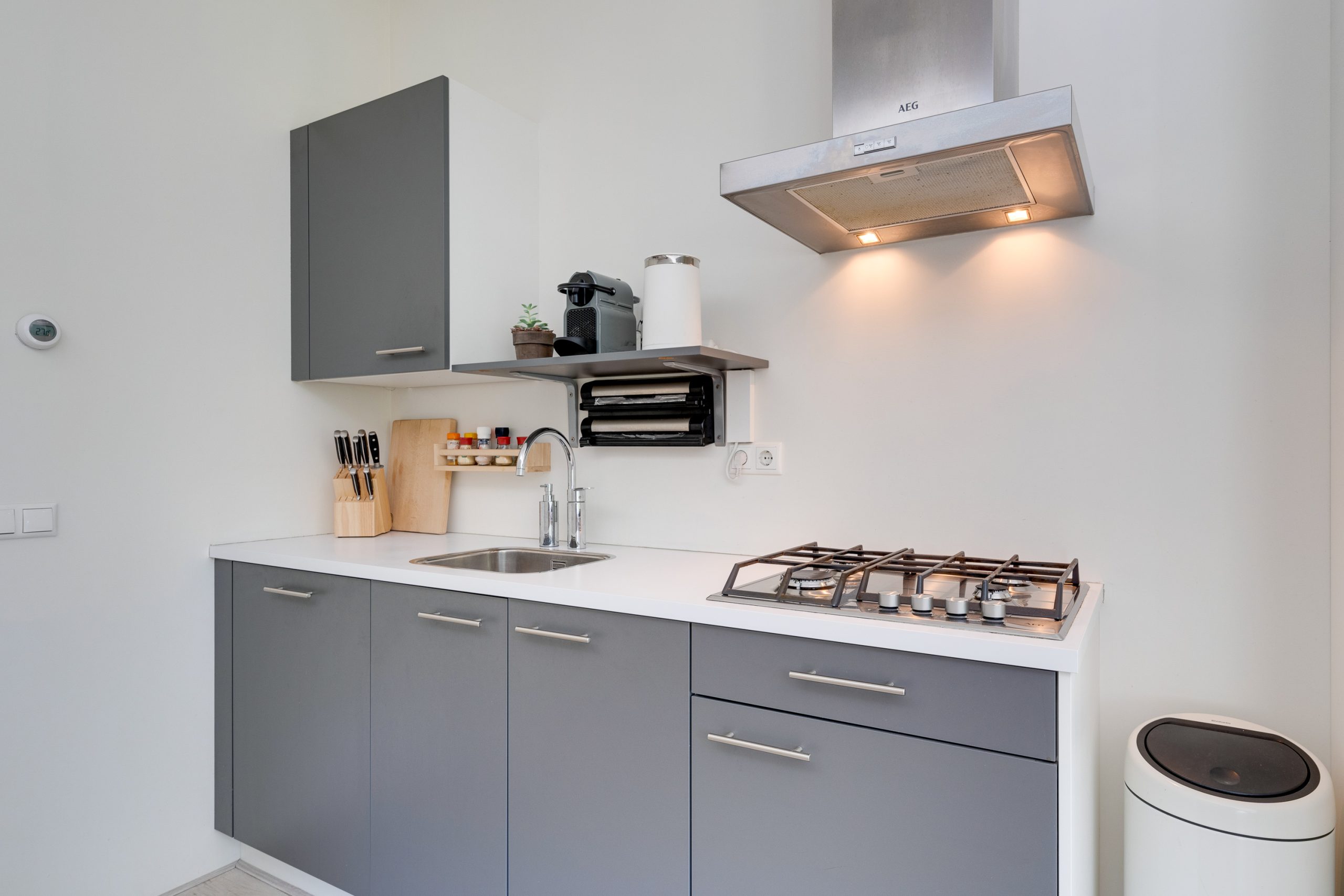 douchecabine, open keuken in rechte opstelling voorzien van vaatwasser, gasfornuis, afzuigkap,
