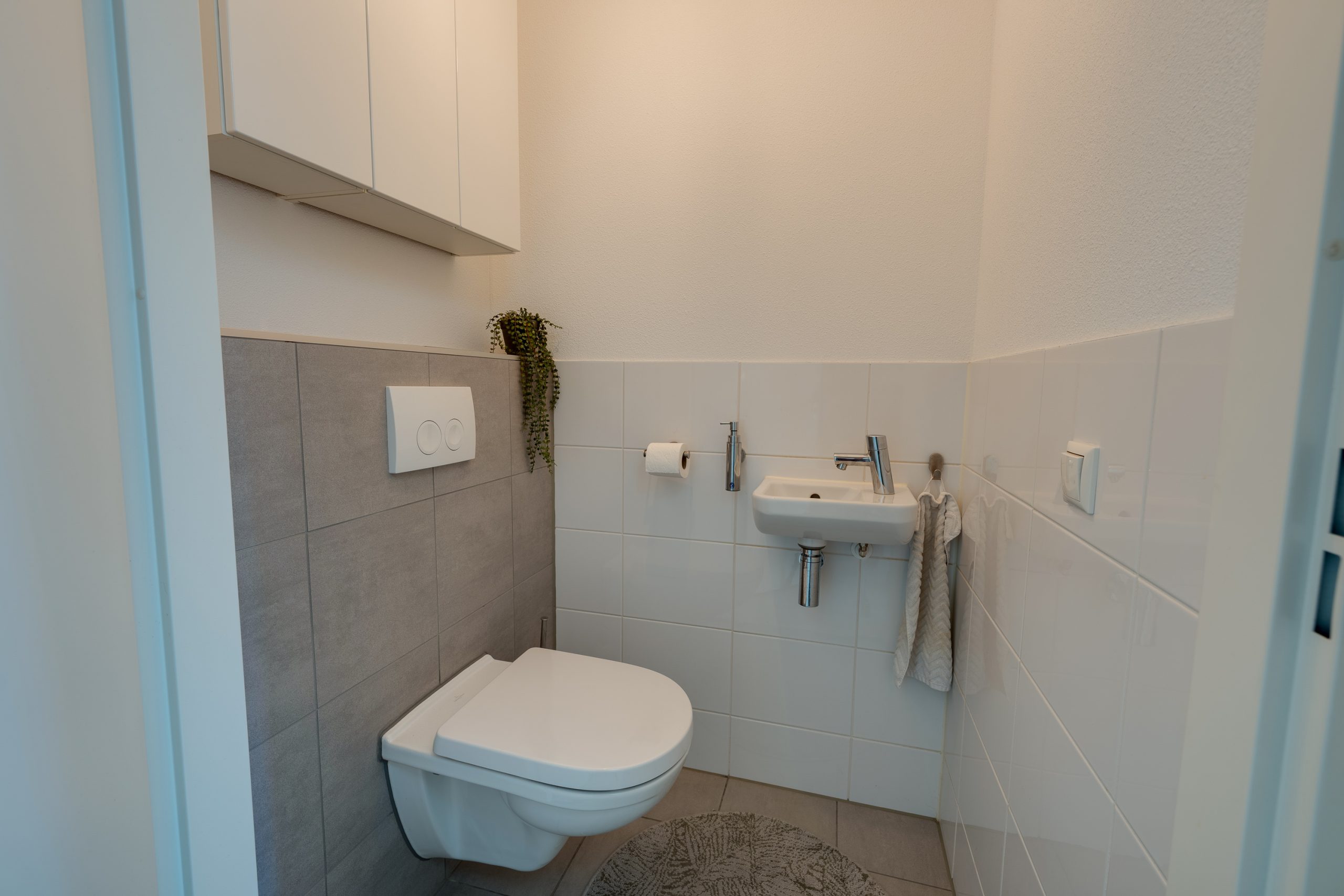 wasmachine aansluiting, CV ketel (Intergas uit 2017) en ventilatieunit, luxe half betegelde toilet