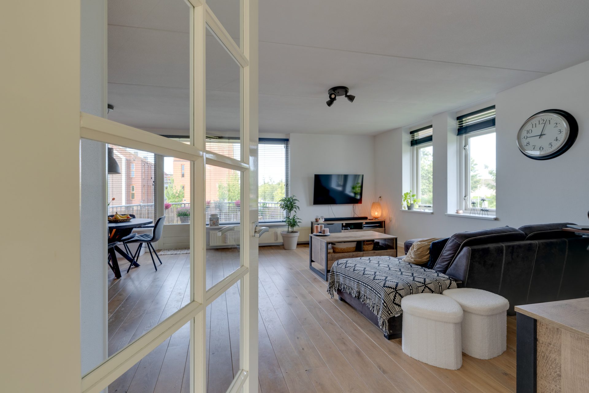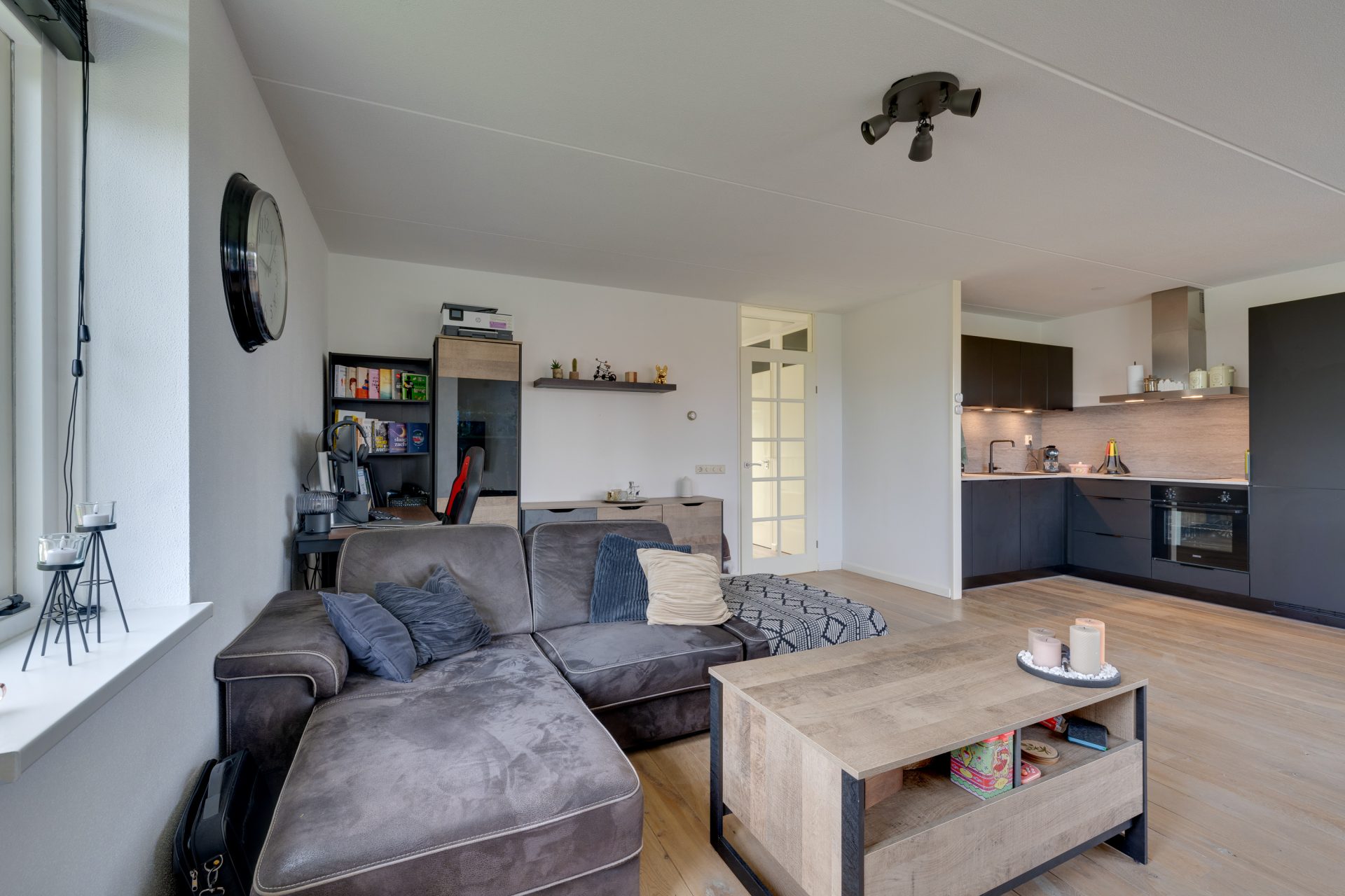 deur naar het balkon en een open luxe keuken in hoekopstelling voorzien van diverse inbouwappatuur. Gehele appartement is voorzien van houten vloerdelen.