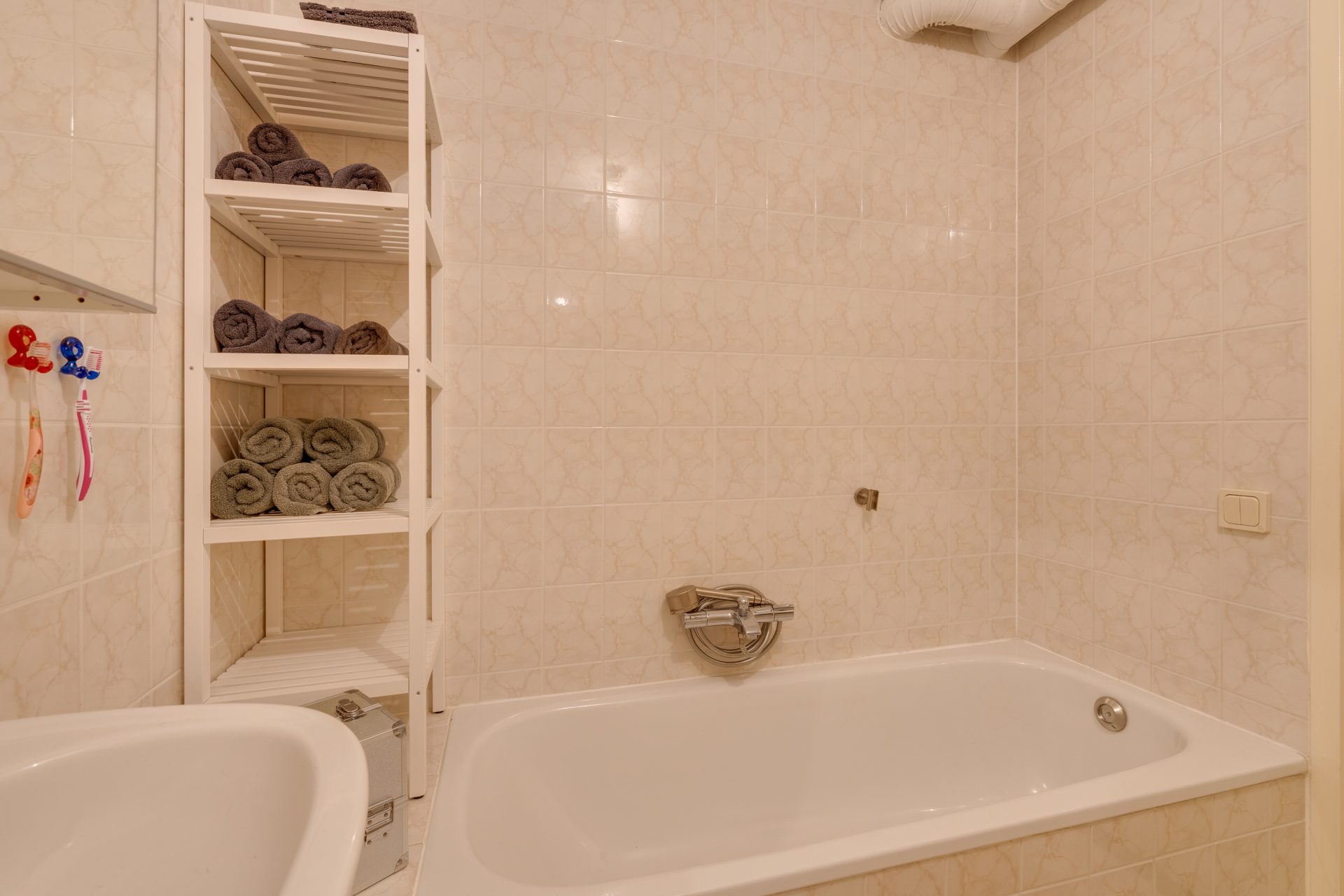 INDELING: Entree met intercominstallatie en toegang tot de royale bergzolder, meterkast (7 groepen en 1 aardlekschakelaar), bergkast voorzien van wasmachine aansluiting, ventilatieunit en CV ketel (Intergas uit 2008), nette betegelde toilet met wandcloset en fonteintje, nette betegelde badkamer voorzien van wastafel, douche en ligbad, slaapkamer, woonkamer voorzien van